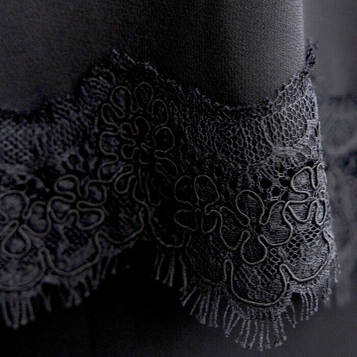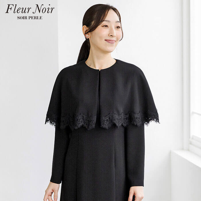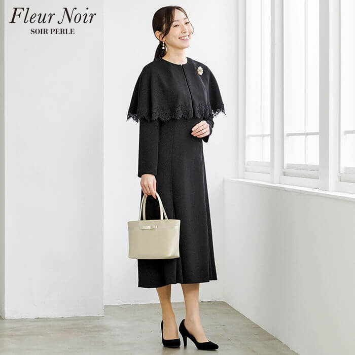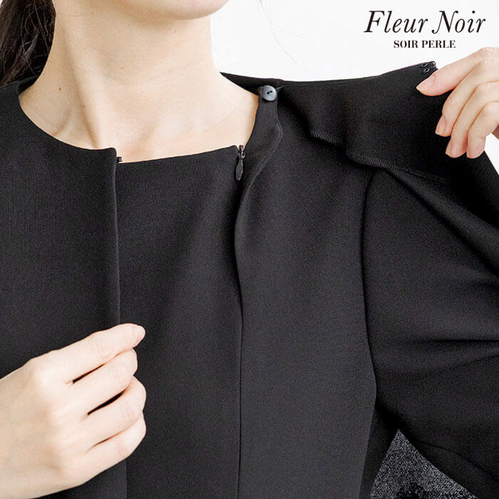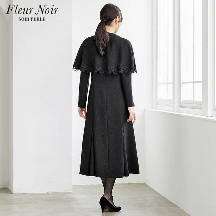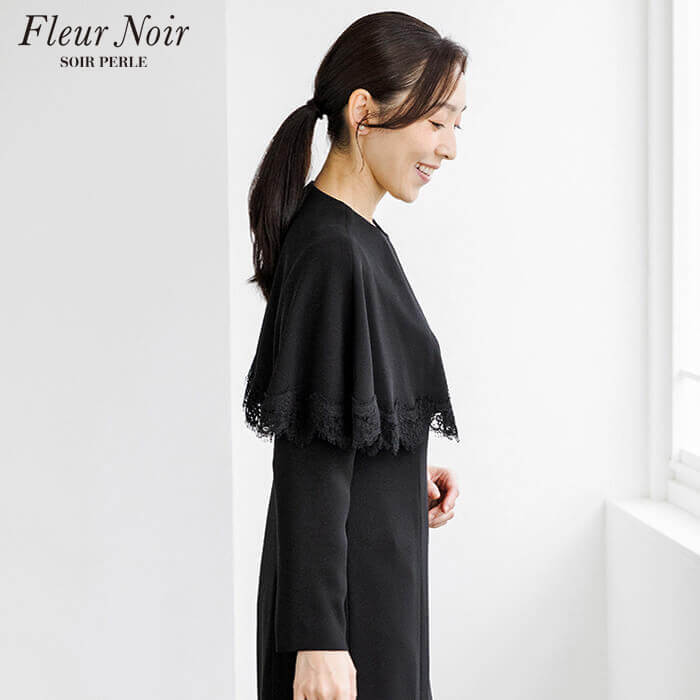 フェミニンかつ繊細でエレガントな「Fleur Noir SOIR PERLE」。 取り外し可能なケープを添えた、女性らしい雰囲気のワンピースです。