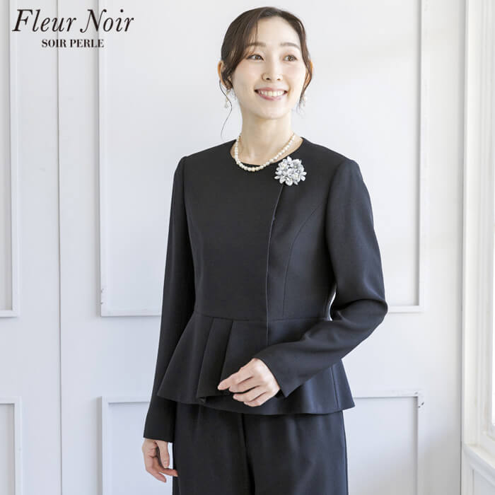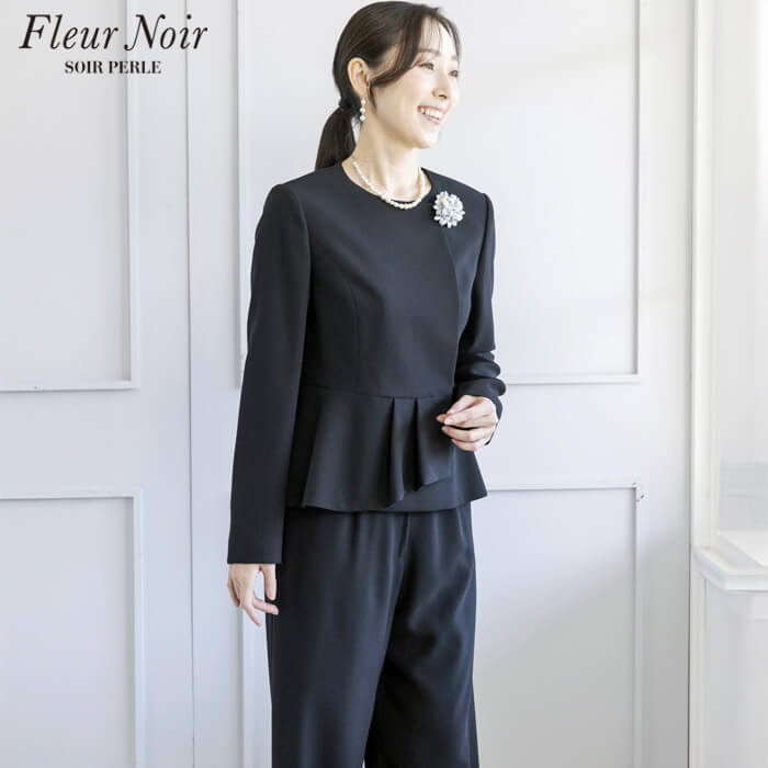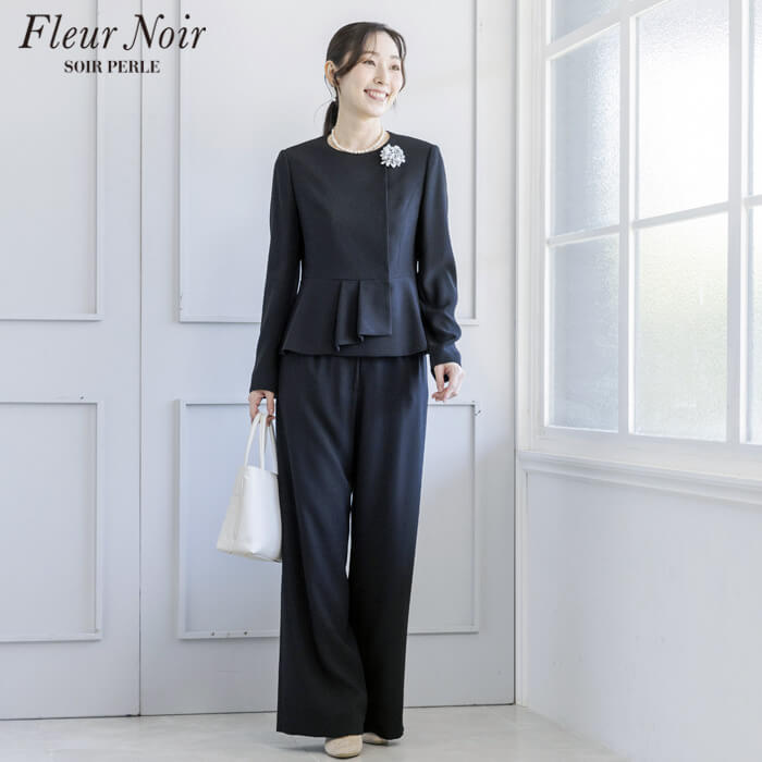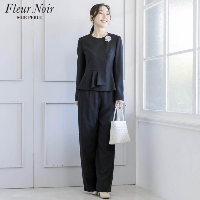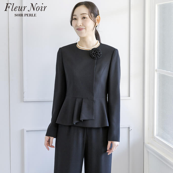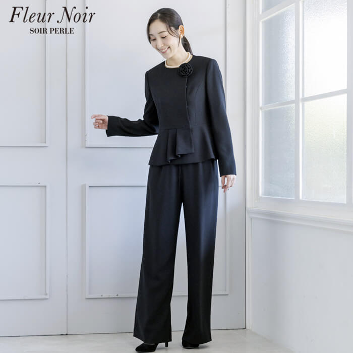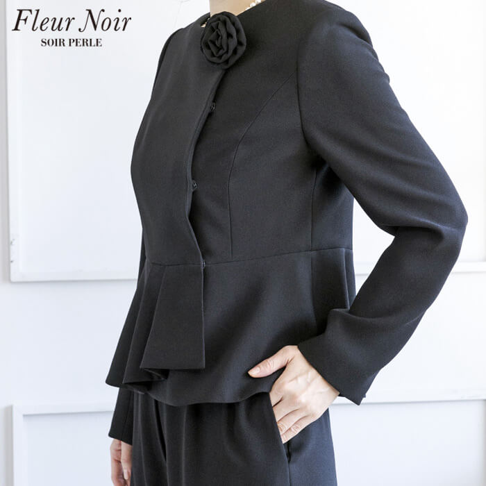 フェミニンかつ繊細でエレガントな「フルールノワール」。 着回し力の高い、コサージュ付きブラックパンツスーツです。