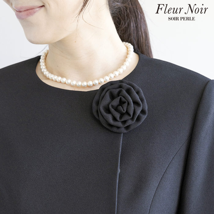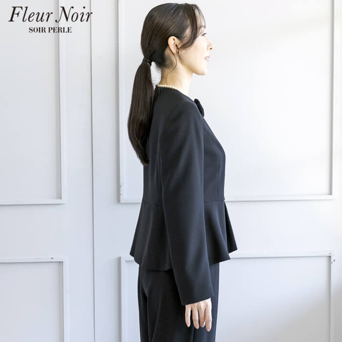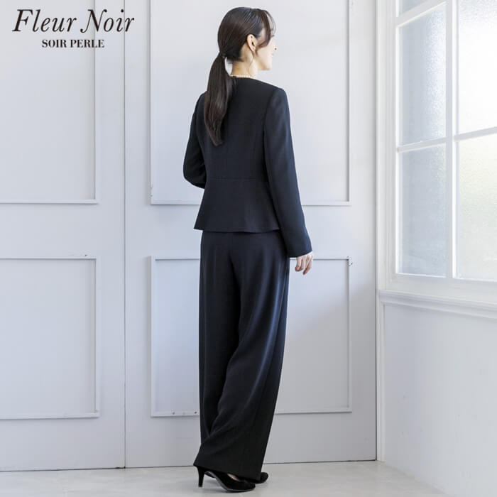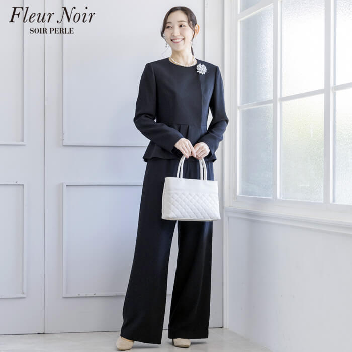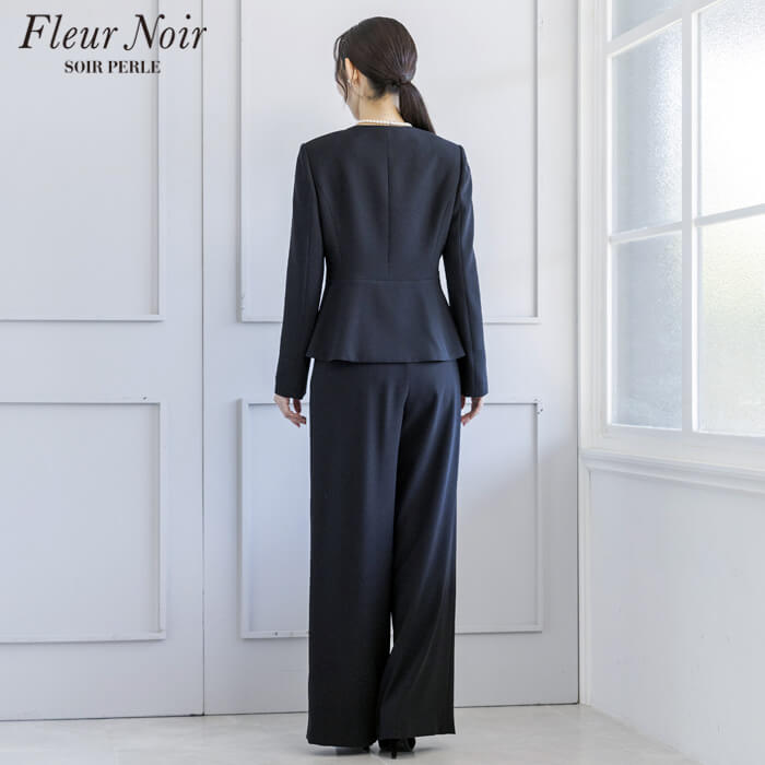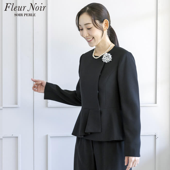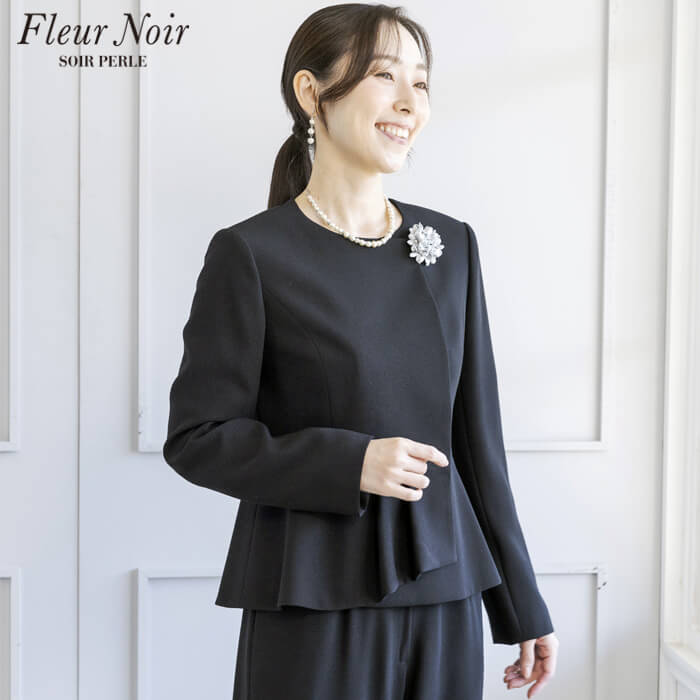 フェミニンかつ繊細でエレガントな「フルールノワール」。 着回し力の高い、コサージュ付きブラックパンツスーツです。