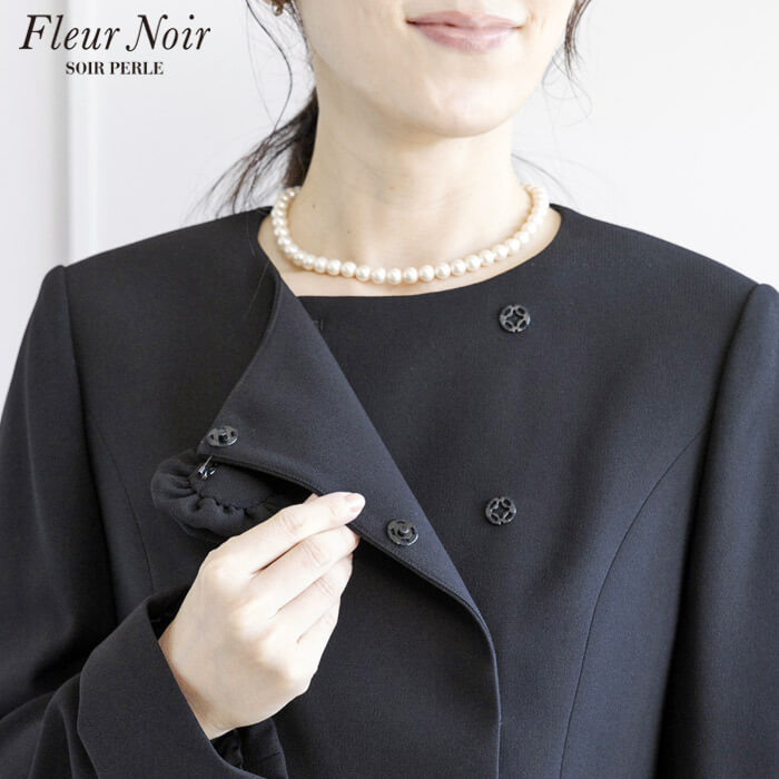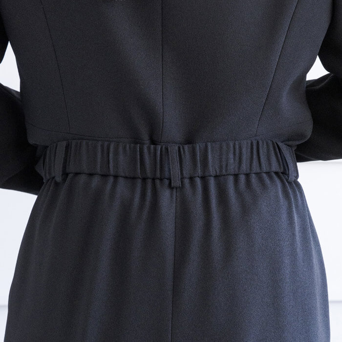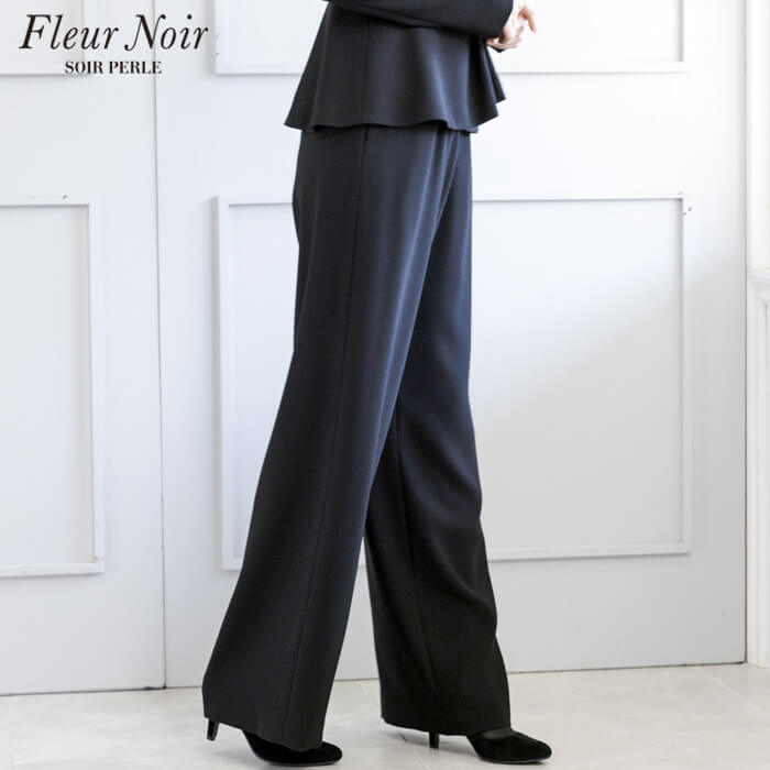 タックデザインが優雅で、共生地のコサージュがアクセントの上品なブラウス。 ホック4か所留めで、きちんとした印象です。 パンツはエレガントなワイドシルエット。 背面ウエストにゴムを入れ、快適な着用感を叶えました。 ベルト通し付きなので、ウエストの調整ができます。 生地は濃染加工を施した漆黒。 共生地のコサージュでホテル葬・法事などの弔事に。 華やかなアクセサリーを添えて、卒業式・入学式・各種式典に。 喪服としてはもちろん、礼服・式服としても安心してお召しいただけます。 教職員の方のフォーマルスタイルとしてもお勧めです。