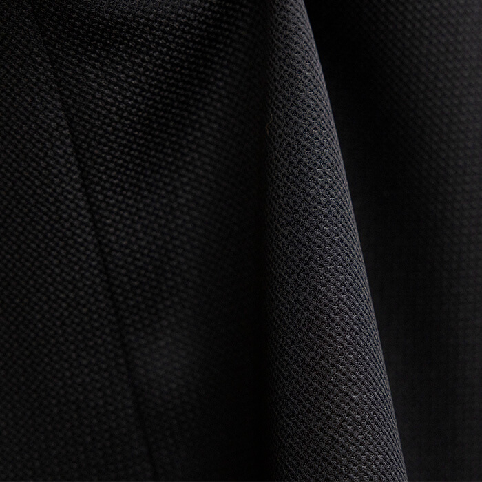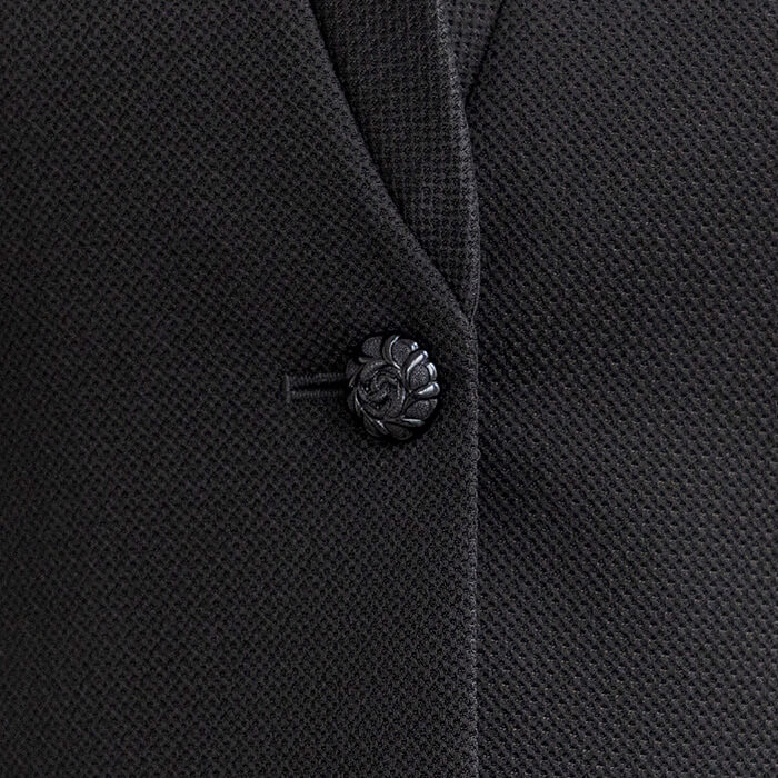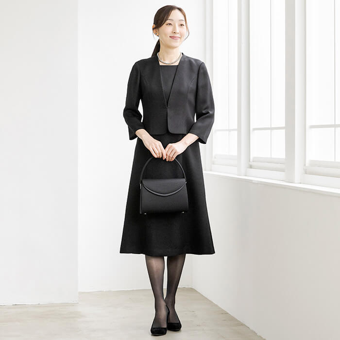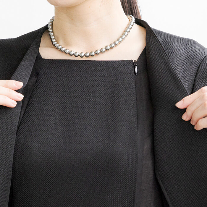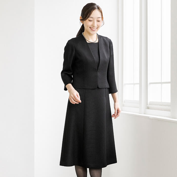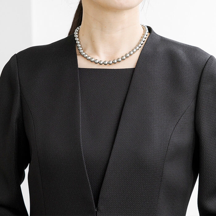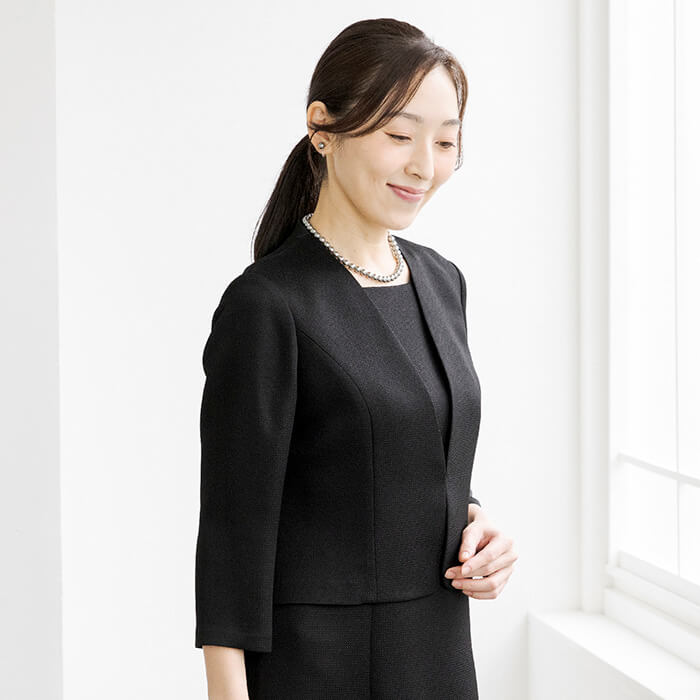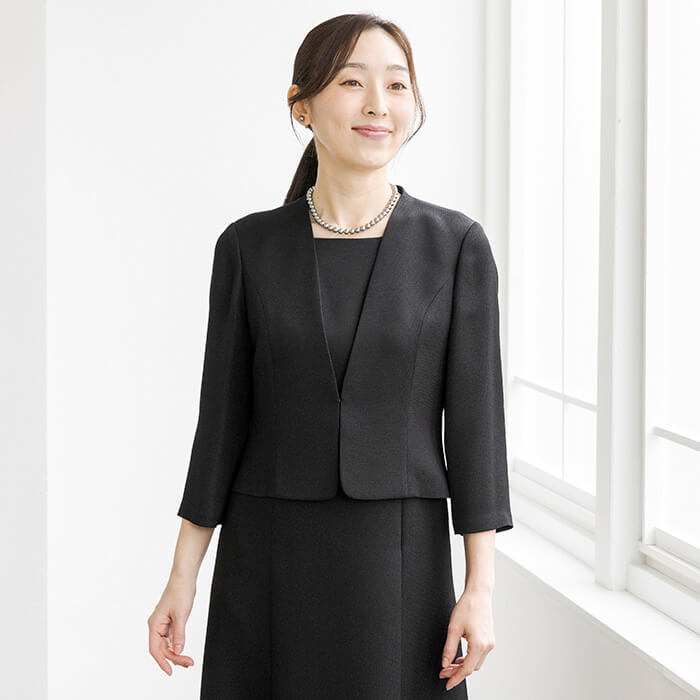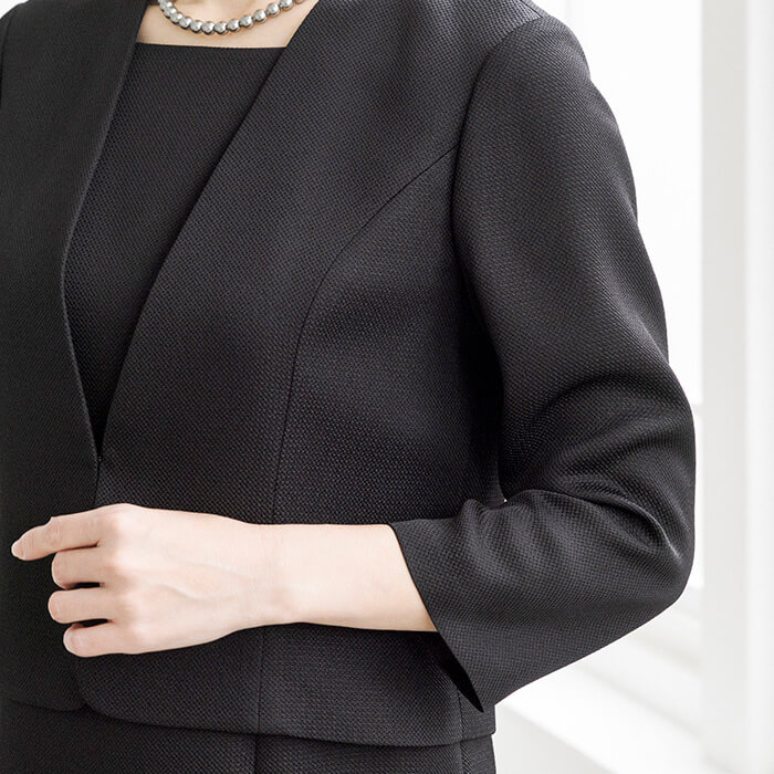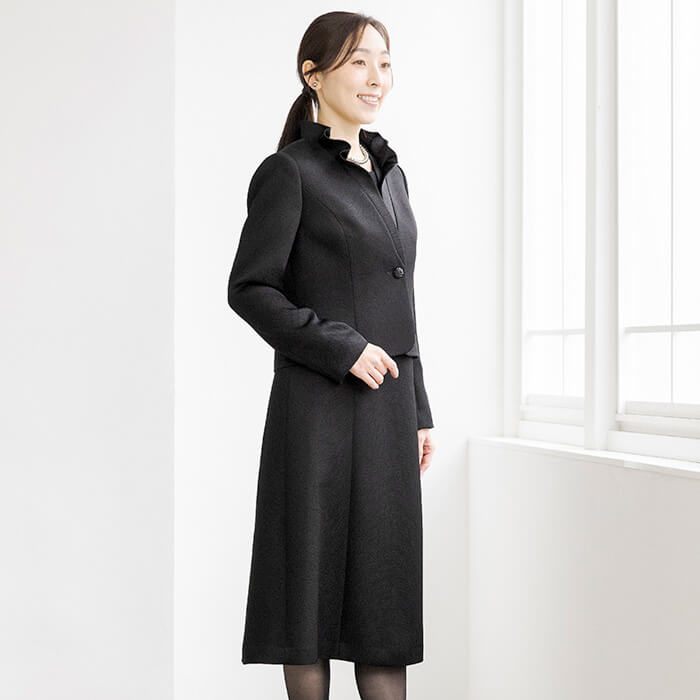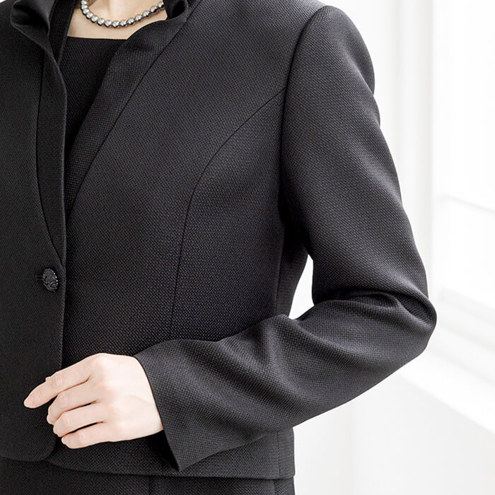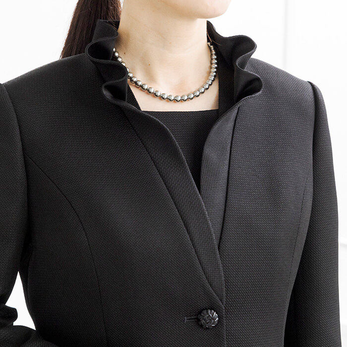 柔らかな印象のフリルカラーと、すっきりしたV開きの胸元がポイントのブラックフォーマル。 ワンピースは左胸にファスナーがある前開きで、着丈はふくらはぎが隠れる長めのフォーマル丈。 控えめな微光沢が高級感を添えるジャカードを使用。 切り替え部分にあしらったサテンも上品なアクセントになっています。 濃染加工による深い漆黒で、季節を問わずオールシーズンご着用いただけます。