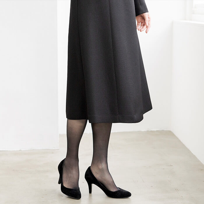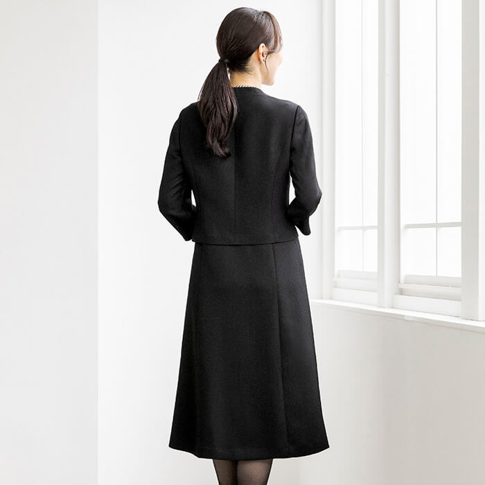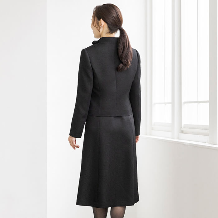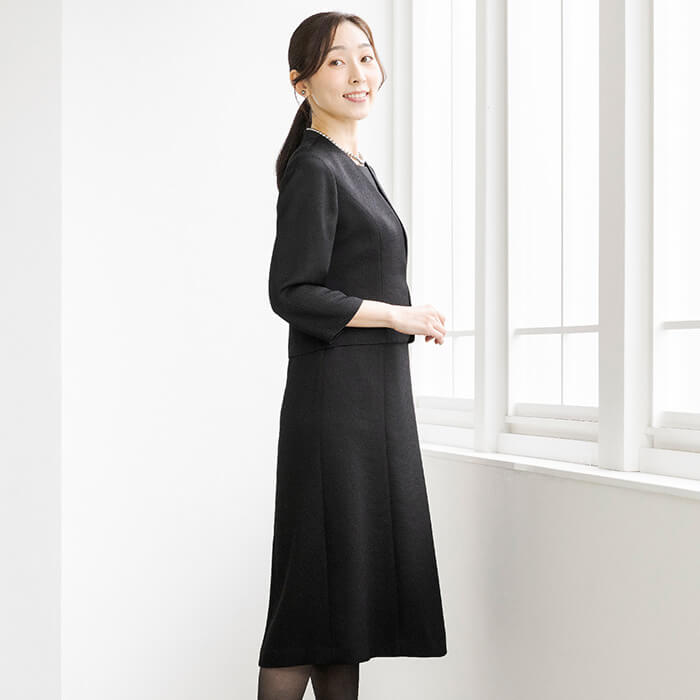 参列者としてはもちろん、喪主やご親族の喪服として自信を持ってお召しいただけます。 寸法は、ミセスにおすすめの「少しゆったり」パターン。 「標準」よりもウエストまわりにゆとりを感じる着心地です。