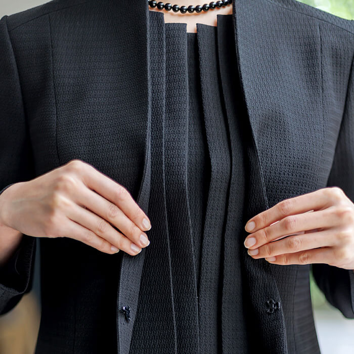 葬儀・お別れ会の喪服・式服としても、慶事の礼服としても活躍します。「少しゆったり」パターンを使用。着丈は膝が隠れるミディ丈。「標準」に比べて、二の腕や背渡り、ウエストを中心にゆとりを持たせています。サイズ表記はイタリア式です。