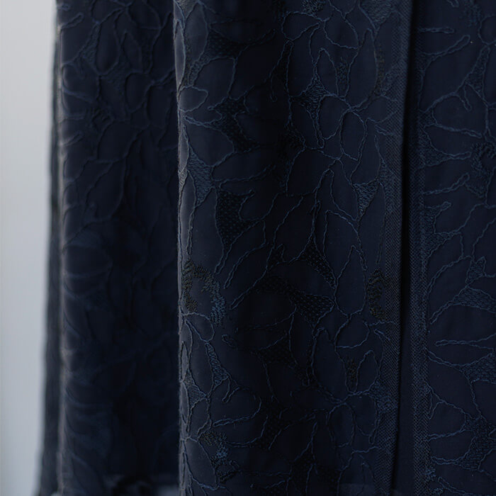 向日葵柄のエンブロイダリーレースを贅沢に使用した、華やかなアンサンブル。 テントラインのやわらかな広がりが、動くたびに美しい余韻を演出し、特別感のある一着に仕上げました。