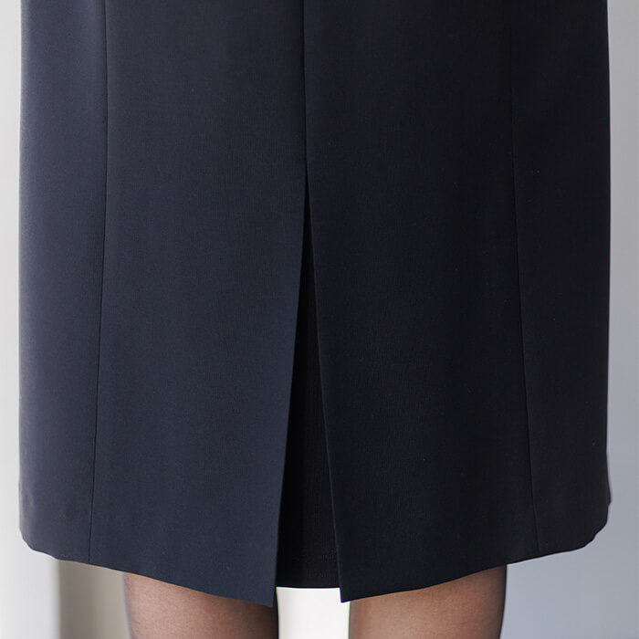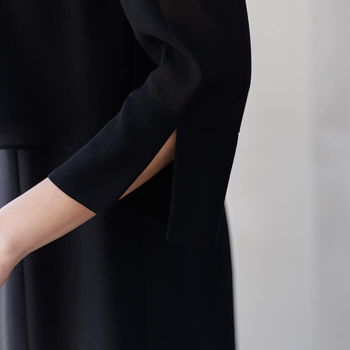 デザインは、縦のラインを強調する切り替えが全体をすっきりと見せ、スタイルアップ効果のあるシルエットを演出。シンプルながらも印象に残るディテールで、格調高い装いを叶えます。ワンピースの袖口に施したスリットがアクセントに。また、ワンピースの前身頃にはウエスト下まで下りる隠しファスナーがあり、腕を後ろに回すことなくスムーズに着脱が可能。