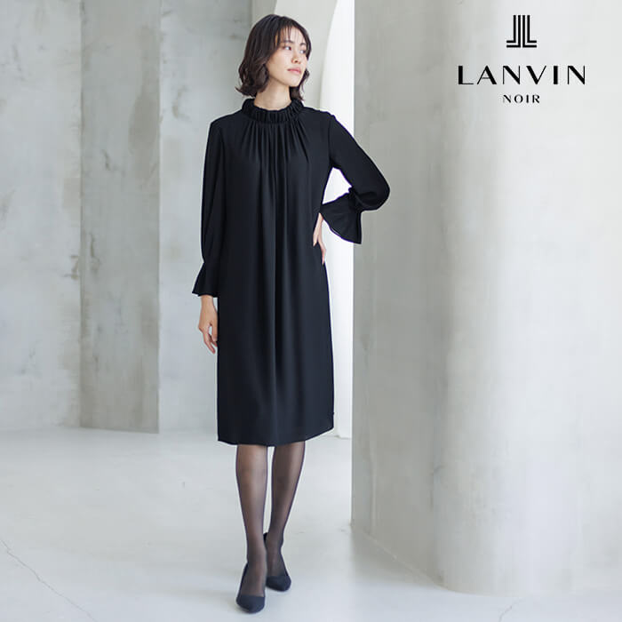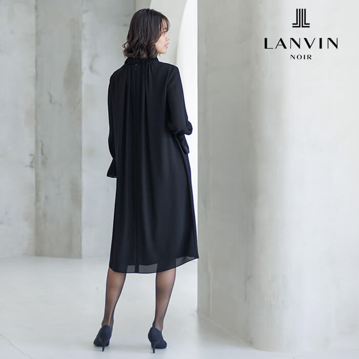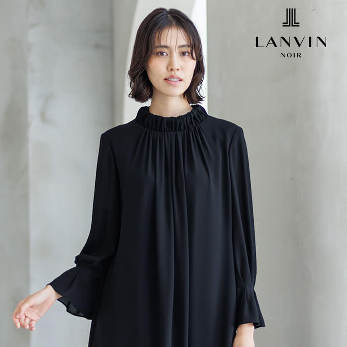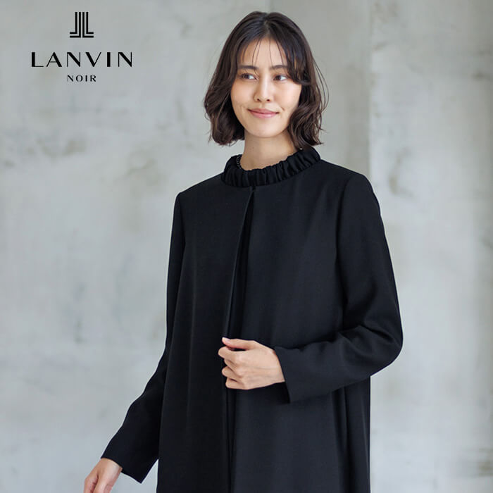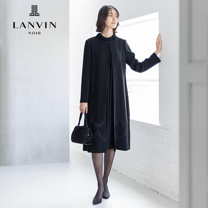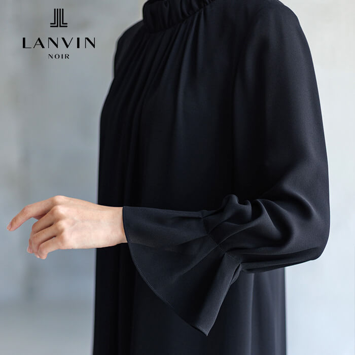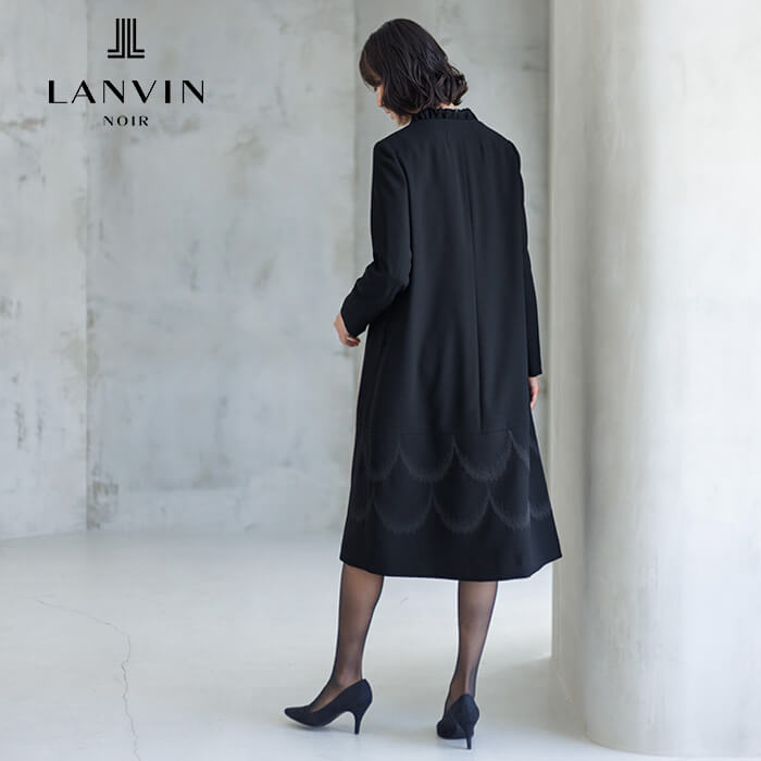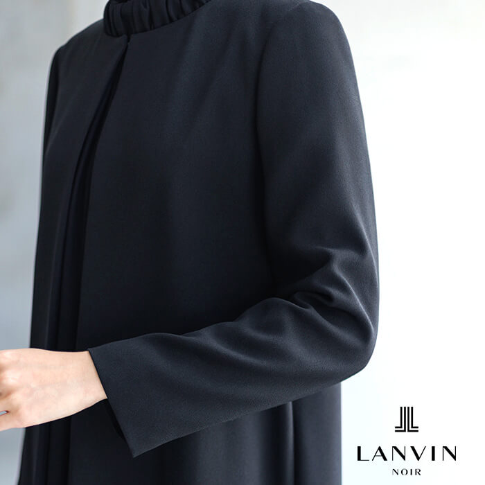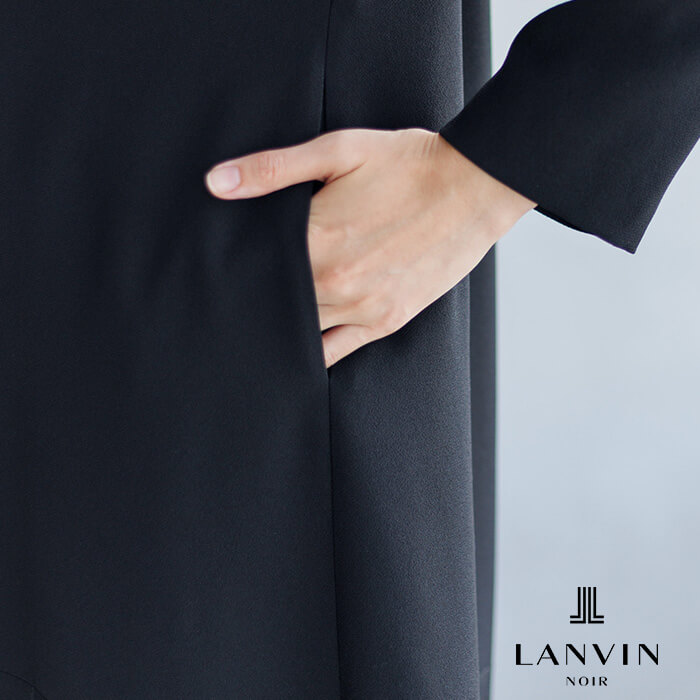 ジャンヌ・ランバンのアーカイブに着想を得た刺繍が裾を彩るロング丈のジャケット。光にあたると、ランバンノワールらしいモダンでエレガントな柄が浮かび上がります。 ワンピースはの首元に施した繊細なギャザーから流れるようにつながるラインとタックをとった袖口もポイントに。スタンドカラーは気になる首元もさりげなくカバーします。 ジャケットの両サイドには、便利なポケットつき。表地は着心地軽やかなポリエステル、裏地は吸湿性が高く肌触りが滑らかなキュプラを使用。
