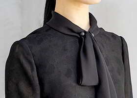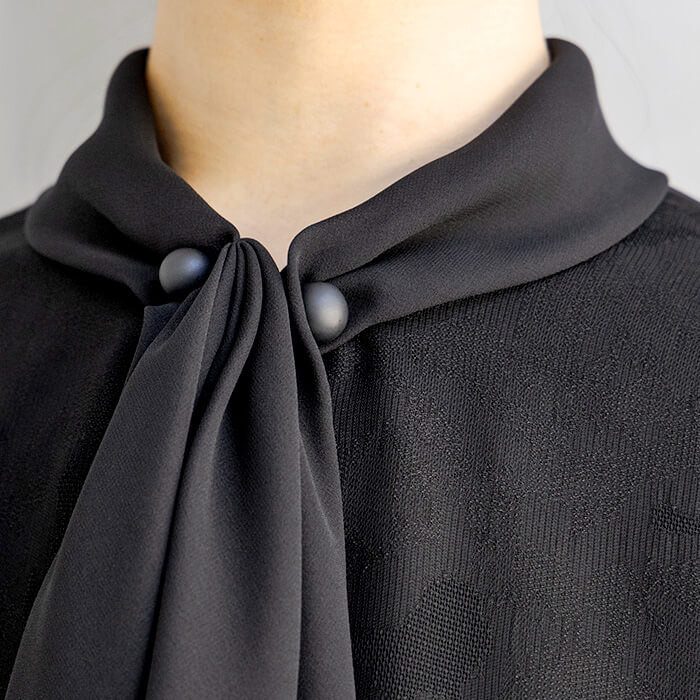ランバンコレクションのデザイン柄を絡み織ぼかしジャカード素材で仕立てた夏用ワンピース。軽い素材感とゆとりのあるオフボディシルエットがランバン ノワールらしいデザイン。着やすさと洗練さの両方を実現。スタンドカラーから繋がるリボンは、アシンメトリーで動きをプラス。あえてショールっぽさは抑え、身頃と一体感のあるデザインに仕立てました。