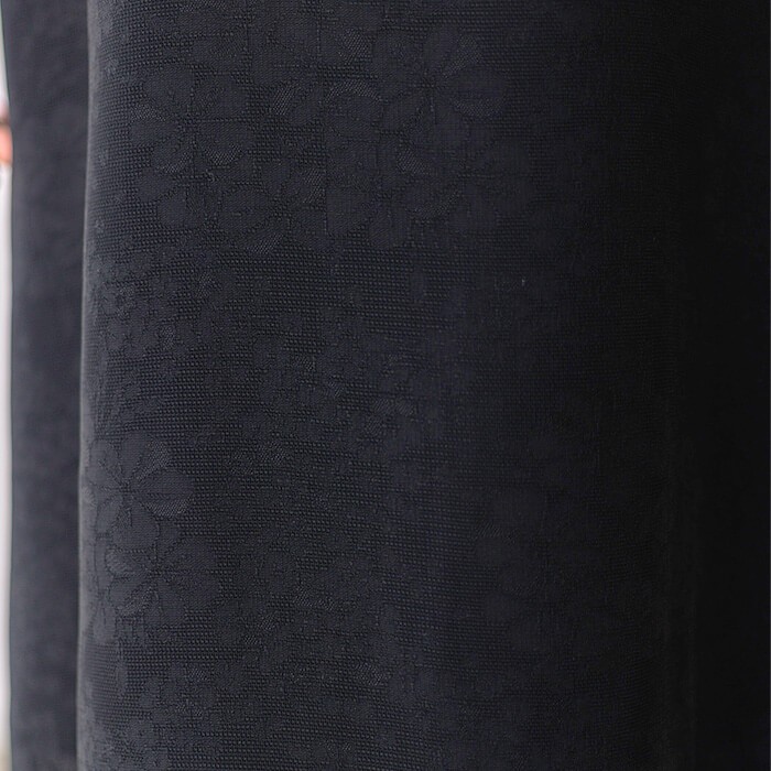 襟元はタックプリーツでリボンを表現し、シルエットはナチュラルなストレートライン。 脇に丸みを持たせたコクーン風のシルエットは、ウエストを締めつけず長時間の着用でも快適です。 使用している生地は大柄の日日草をモチーフにしたオリジナルのジャカード。 米沢産の「絡み織」は、通気性に優れた夏の高級素材。 濃染加工による漆黒の深い黒なので喪服としても安心です。