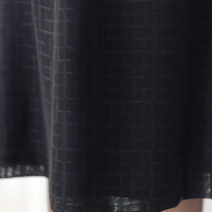 切り替えをアクセントにしたシンプルなAラインの正統派ブラックフォーマル。 襟元と袖口のサテンパイピングがアクセントになっています。 オリジナルの絡み織ジオメトリック柄ジャカードは、通気性に優れ暑い季節も快適な着心地です。 表地は、ブラックフォーマル用の濃染加工をしている漆黒なので喪服として安心です。 裏地にもこだわり、上身頃は通気性に優れたサップ裏地、ドレス部分は皺になりにくい裏地を使用。 汗をかいてもベタつかず、爽やかに過ごしていただけます。