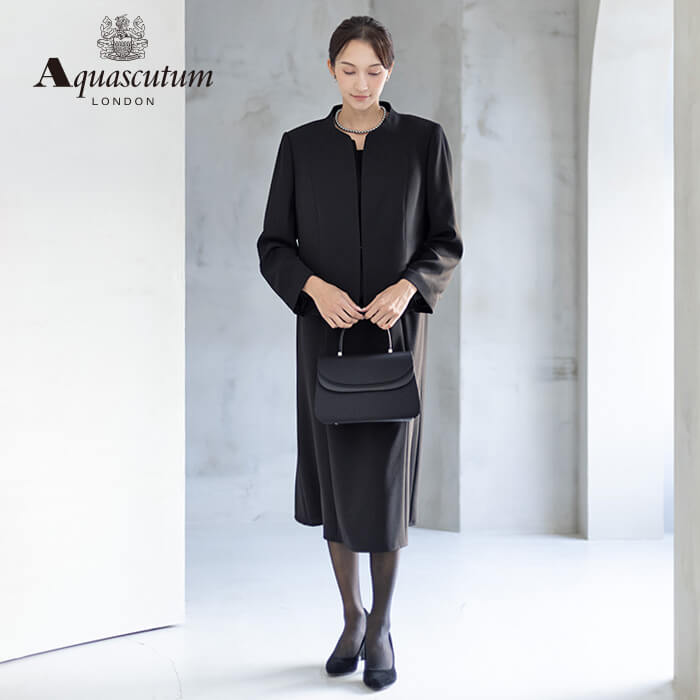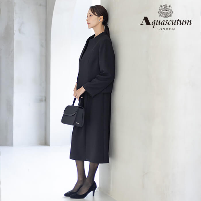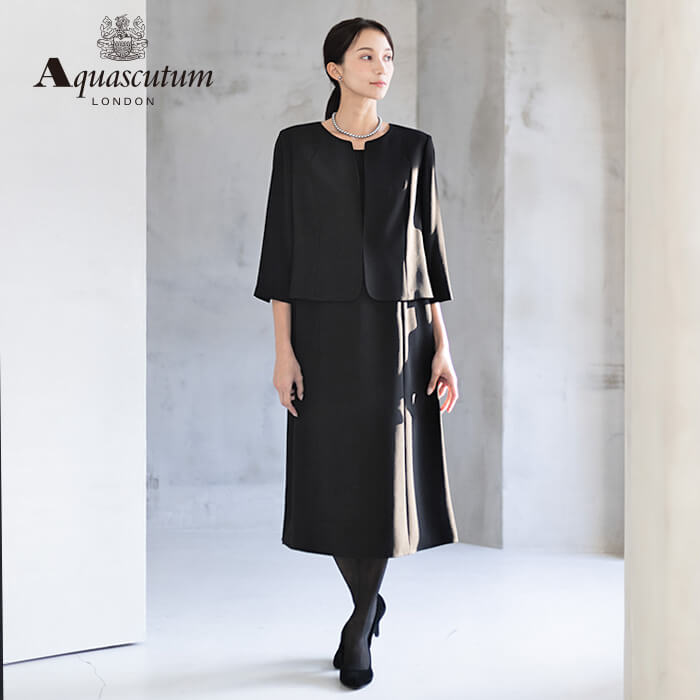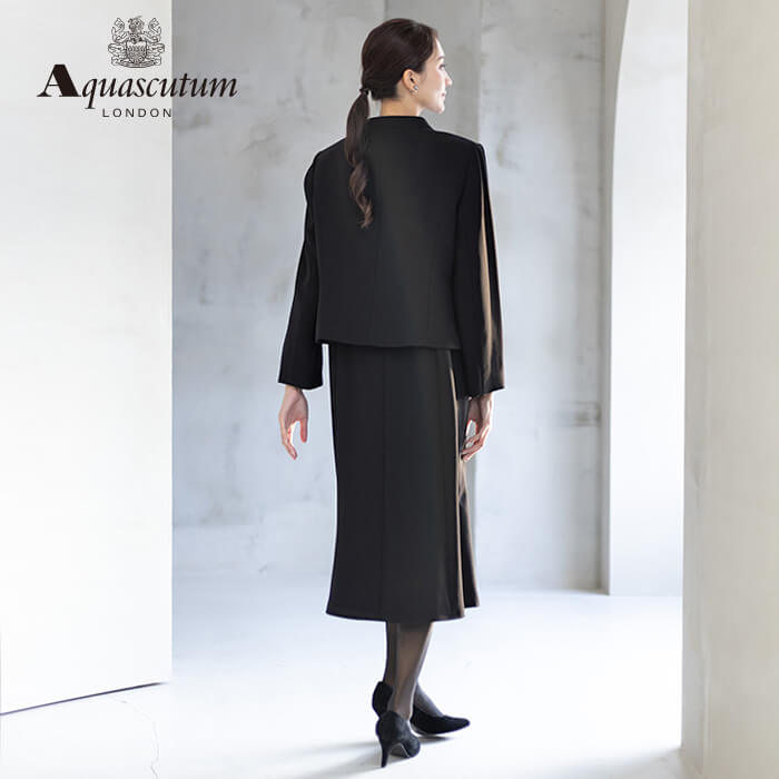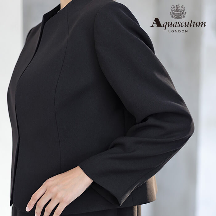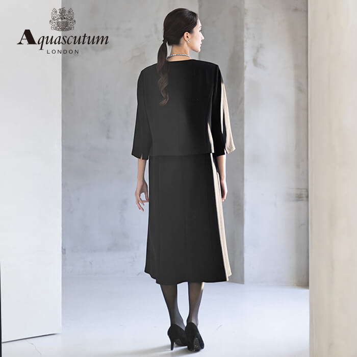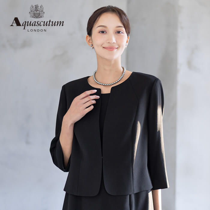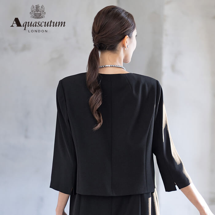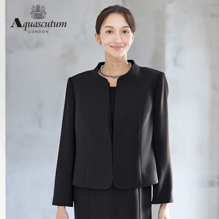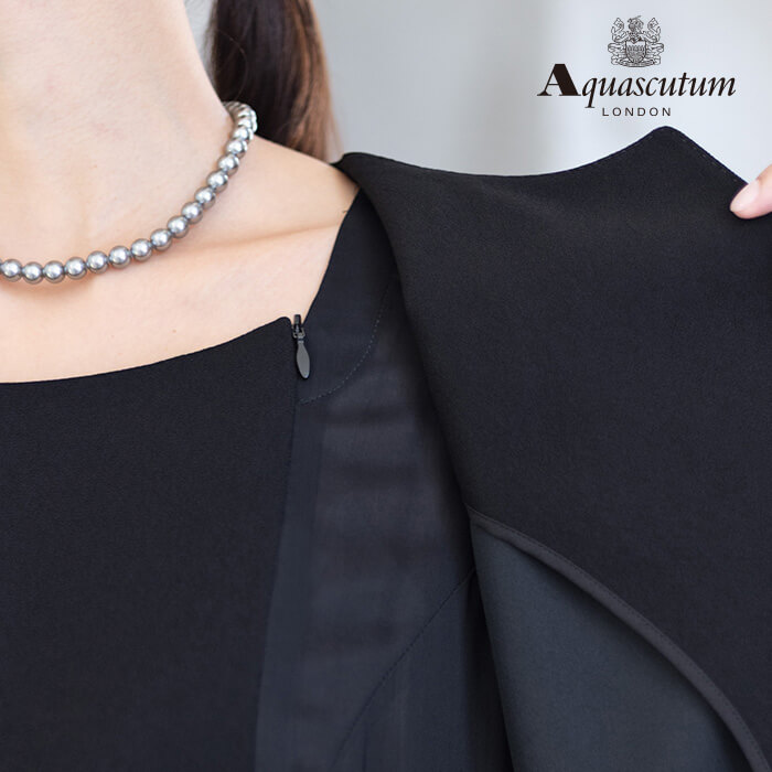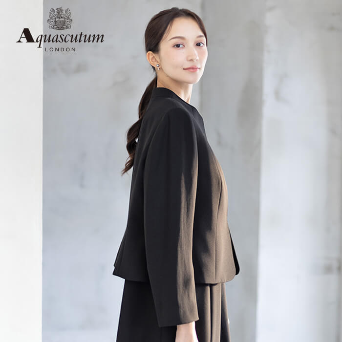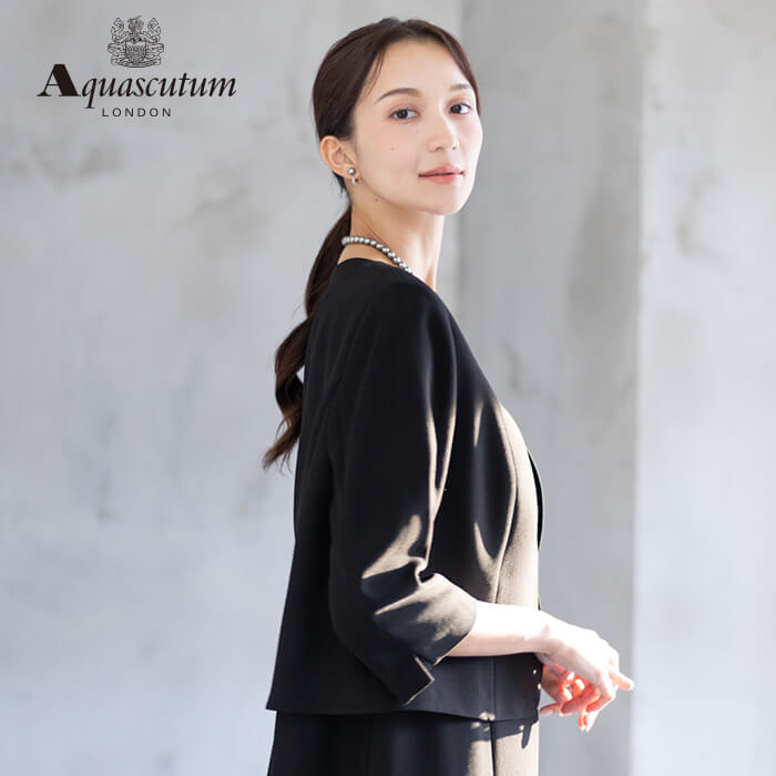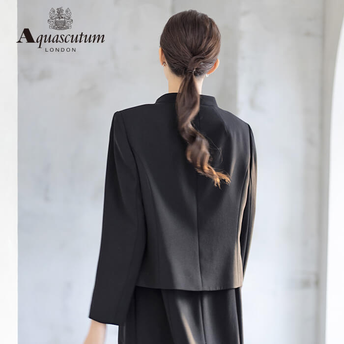 170年以上の歴史を持つアクアスキュータムのエッセンスを踏襲し上質を知る女性に向けて“本物”という財産に現代の“普遍”を融合した人気のブラックフォーマルをひとまわり大きくした、Lサイズアンサンブルを提案します。