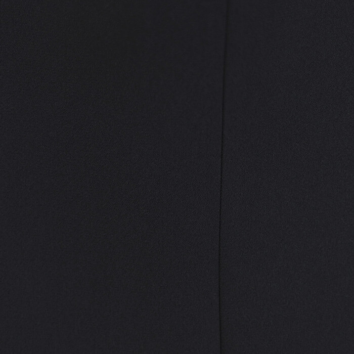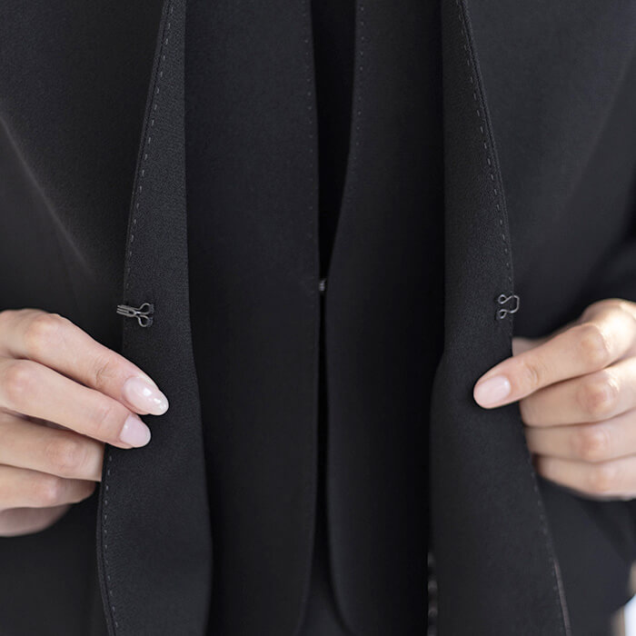 ミセスの身体にきれいに沿うようパターンを設計したノーカラージャケットに、七分袖のジャケットを羽織ったように見えるフロントオープンワンピースをセットしたブラックフォーマルアンサンブル。ジャケットは一箇所のカギホックで留めるタイプ。襟元を少し立ち上げた作りが大人の気品を感じさせます。襟元からフロントのハンドステッチ風デザインが慎ましさの中にクチュール感を添えています。ワンピースにもジャケットと同様のステッチが。上着を羽織っているようなトリックワンピースは、単品でもきちんと感が損なわれないうれしいデザイン。セミフレアーに仕立てた裾は足さばきもよい形。落ち着いた無地のバックサテンジョーゼット製で、すべての喪の席にきちんとしながらも気負いなく着用いただけます。