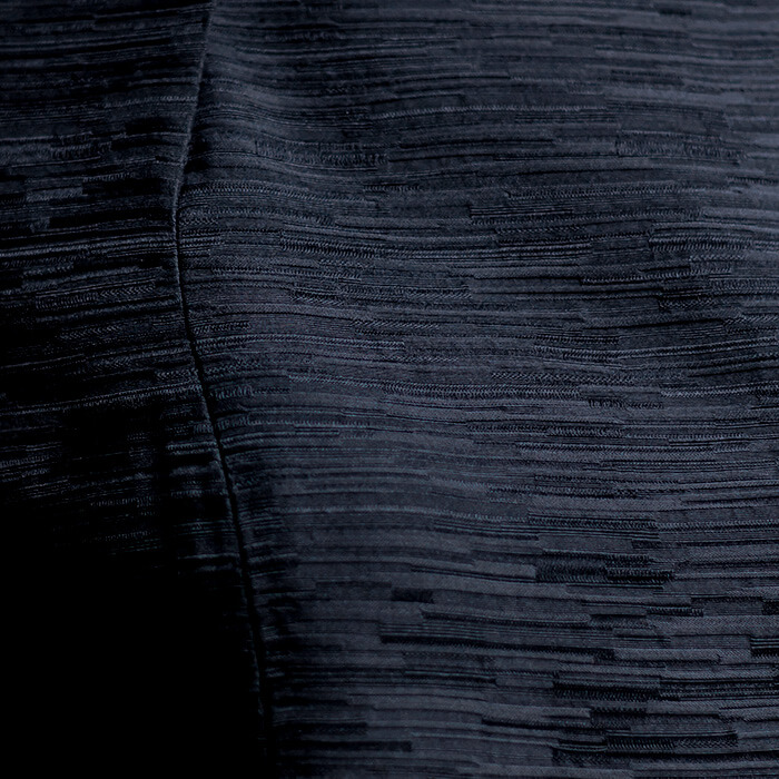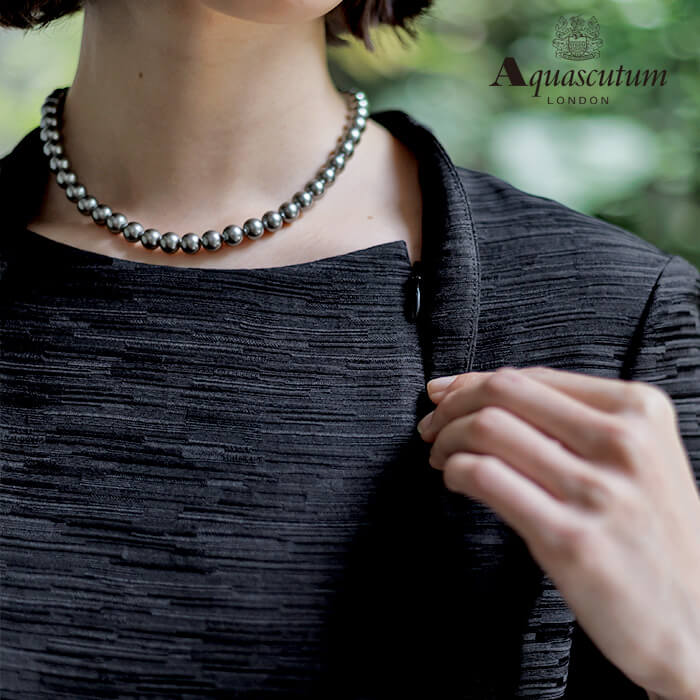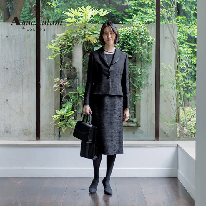 160年以上の歴史を持つアクアスキュータムのエッセンスを踏襲したブラックフォーマルコレクション。 ヘチマカラーのジャケットと前開きのワンピースを合わせたオールシーズン対応のアンサンブル。 すべて国内で仕上げた純日本製品に付与されるJ∞QUALITY認証を受けています。 シルク100%で織り上げたランダムボーダージャカードを使用した最高級のフォーマルスーツです。