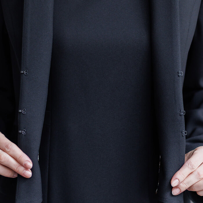 生地には「美しさ」と「快適さ」を両立した上質素材を使用。 トリアセテート混ならではの微光沢が奏でる深みのあるブラックはシンプルなデザインによく映えます。 しなやかで柔らかく身体の動きに寄り添うストレッチ性があり、長時間着ていても疲れにくい素材です。