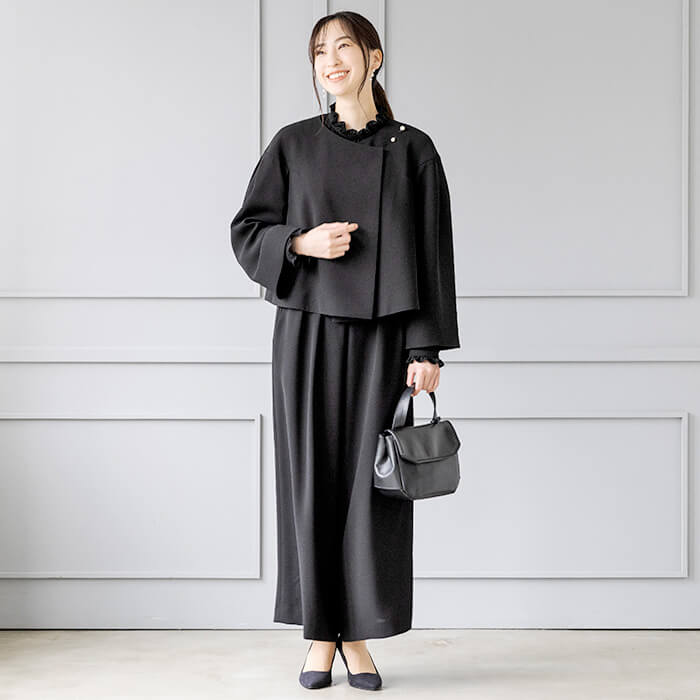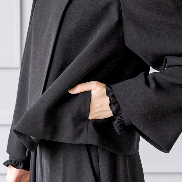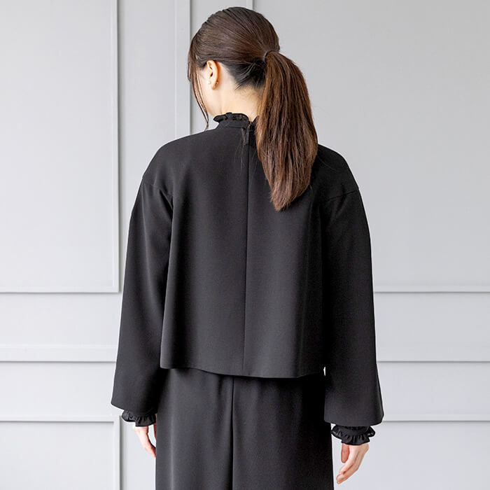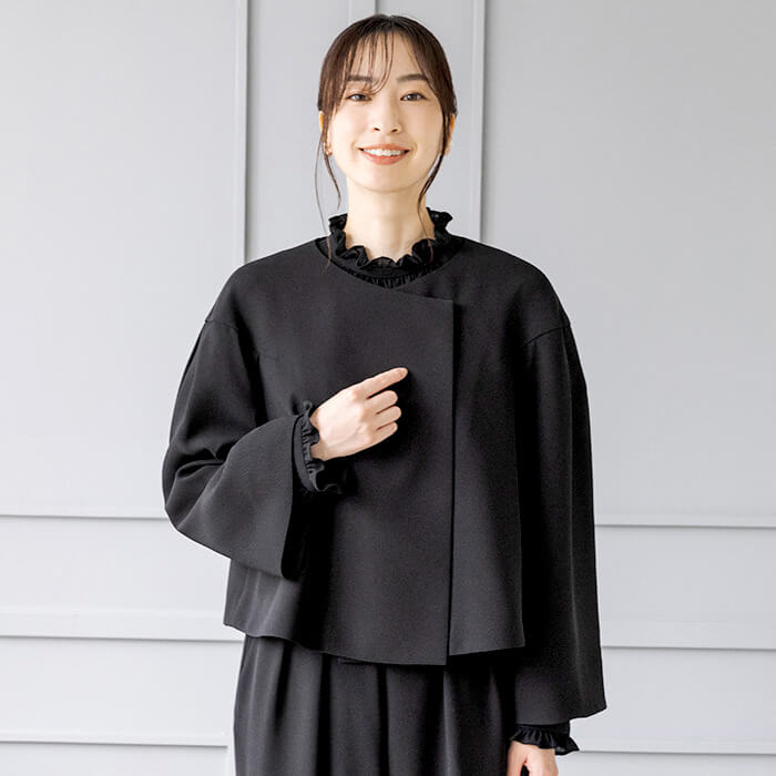 変化するご葬儀のスタイルに合わせ、どんな喪のシーンにもなじむブラックフォーマルのボレロジャケット。