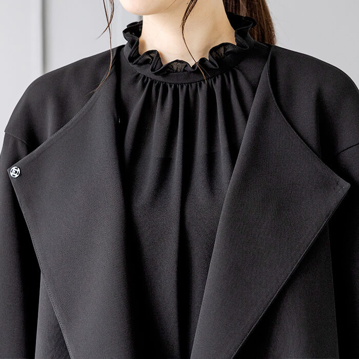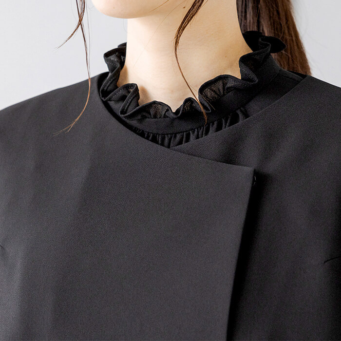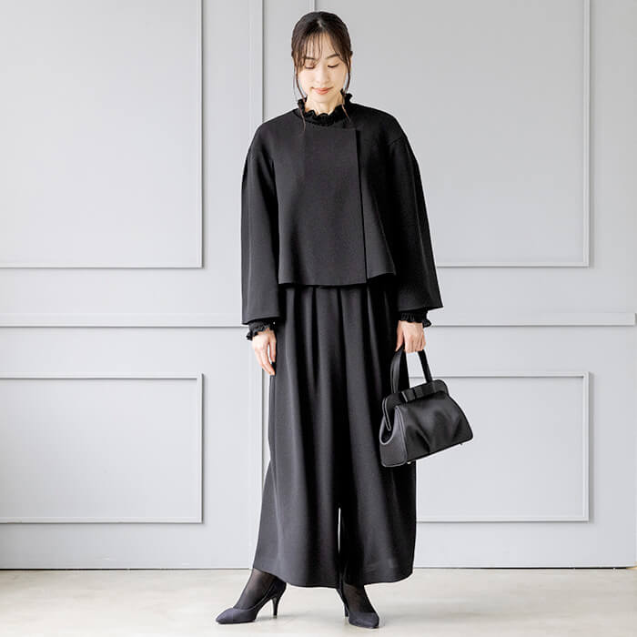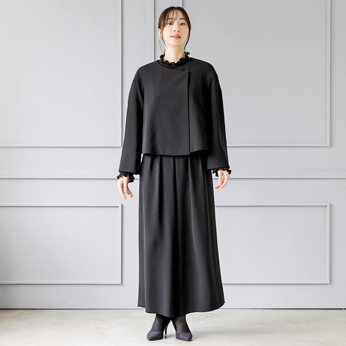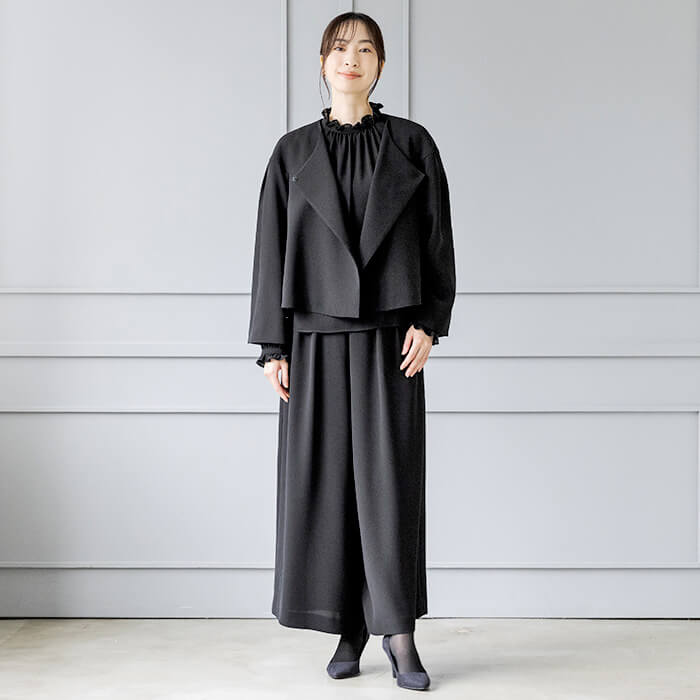 同シリーズのブラウス(1306100-00)や パンツ(1307100)とのセットアップコーディネートもおすすめです。 濃染加工による漆黒の生地を使用し、季節を問わず着用できる通年仕様。 葬儀・告別式・家族葬・お別れの会などの喪服としてはもちろん、セレモニーや日常のブラックコーデにも活躍します。 サイズはM・Lの2種類。 ご自宅でのお洗濯はウォッシャブルフォーマルのお洗濯方法をご覧下さい。
