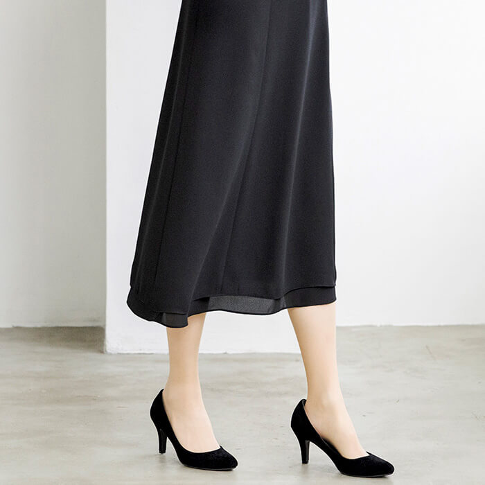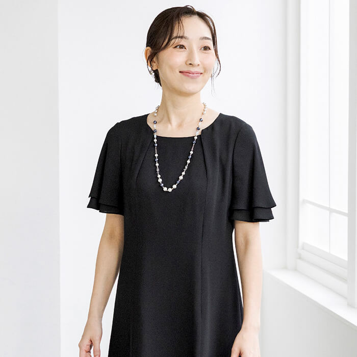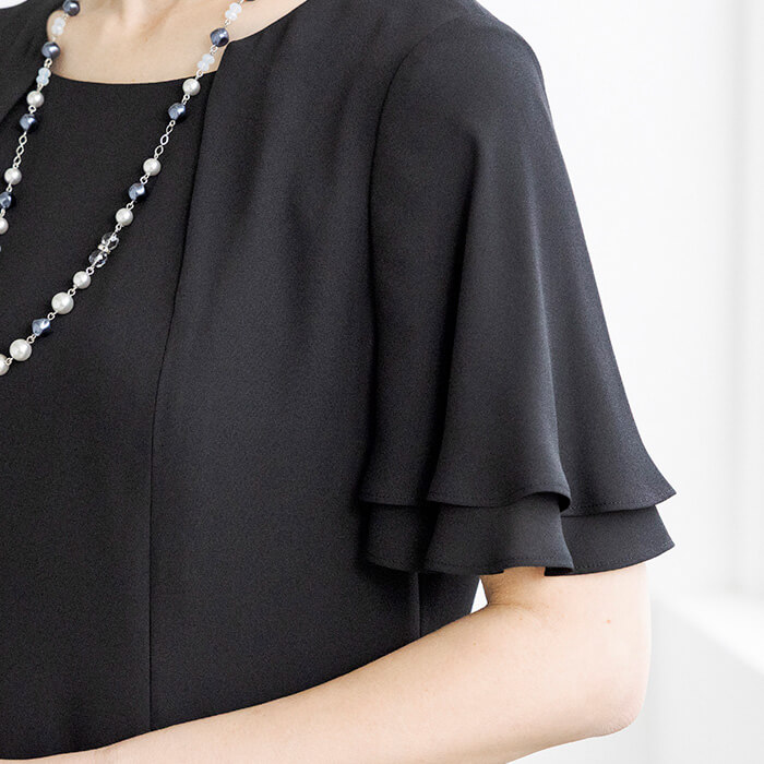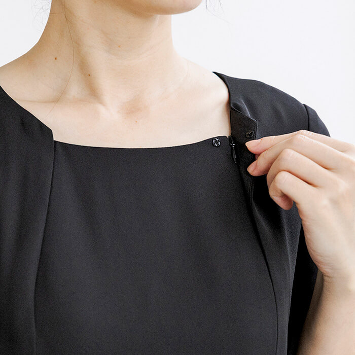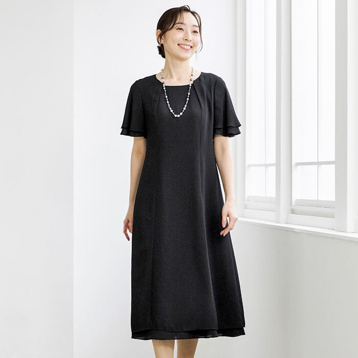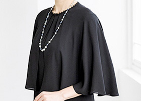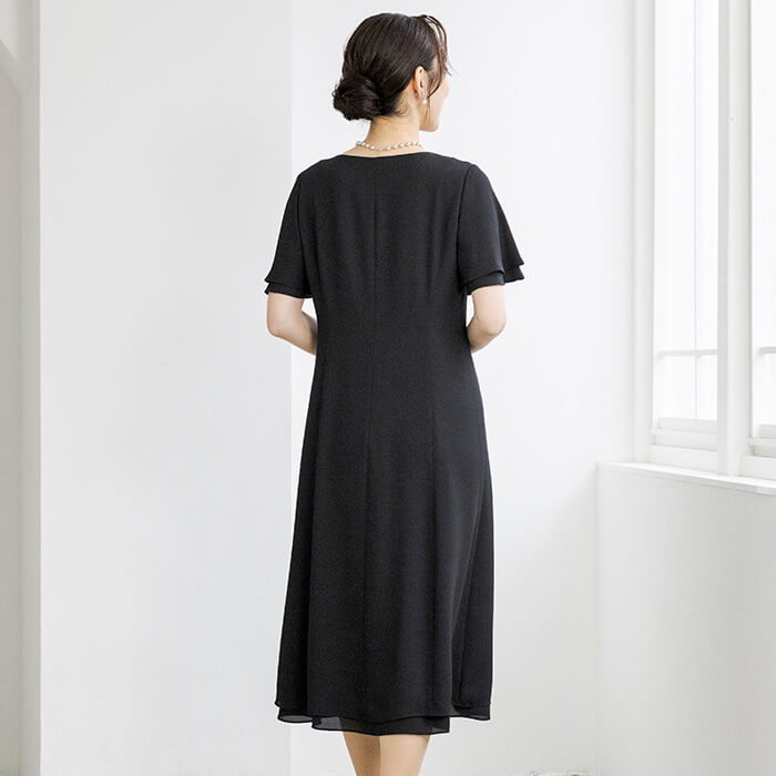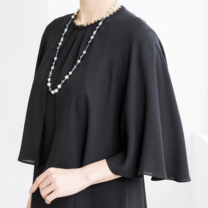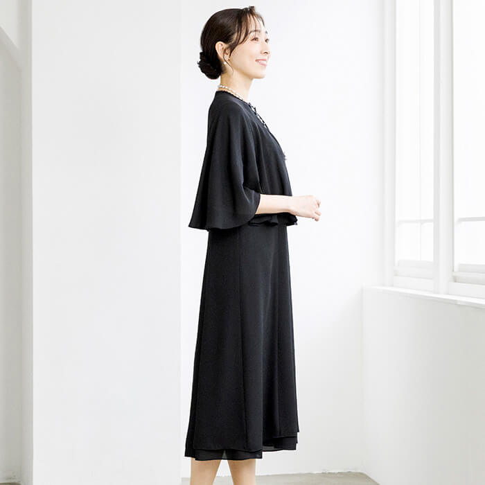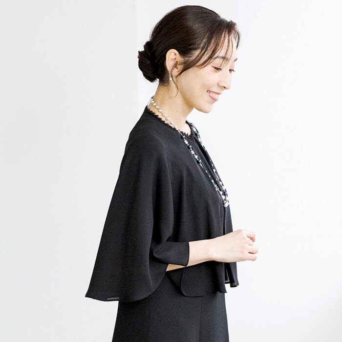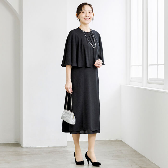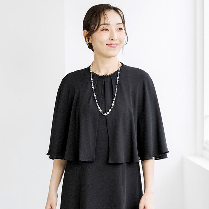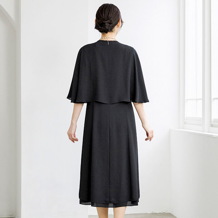 同素材のケープがセットになった、オールシーズン対応のフォーマルワンピース。前開き仕様で着脱しやすく、忙しいお支度時間もスムーズに。ケープは気になる腕回りを上品にカバーしながら、体温調節が難しい夏場の冷房対策にも活躍。シンプルなワンピーススタイルに、ケープを重ねればよりエレガントな印象へと変化。