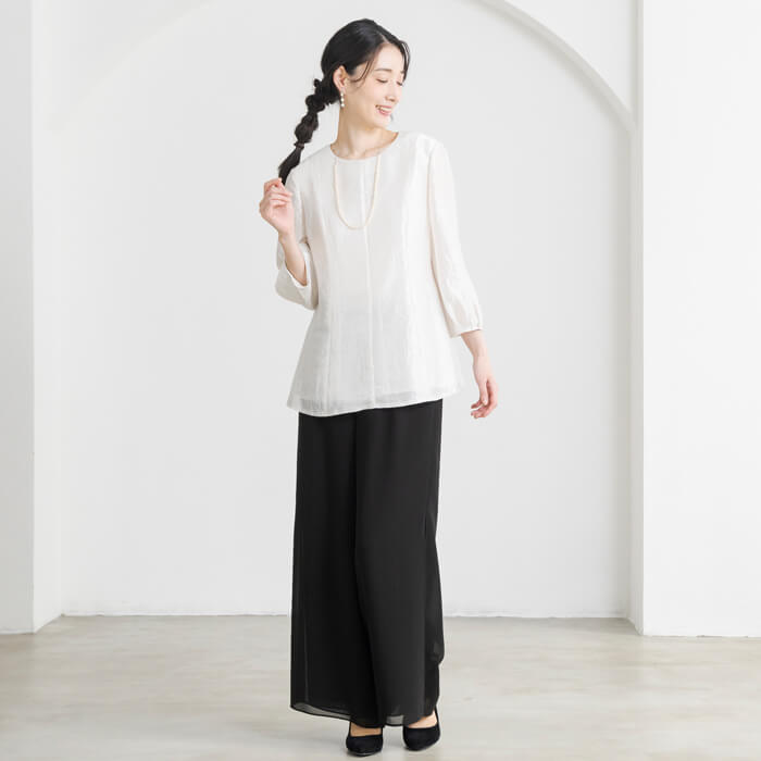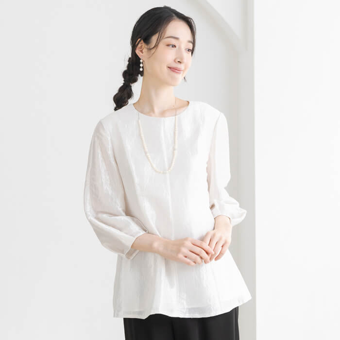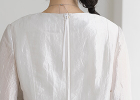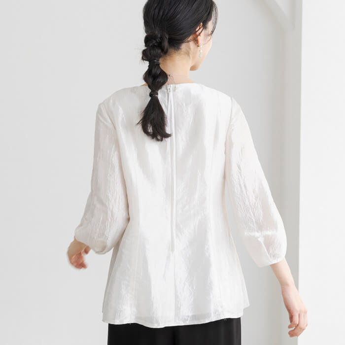 ハリ感と軽さが特徴の「カールマイヤー」という生地を使用した洗えるブラウス。 構築的なパフスリーブ、縦の切り替え、長めのペプラムが、大人エレガンスな印象です。 ファスナーにはスライダーリボンがついて着替えも簡単。 ロングスカートやワイドパンツとの相性も良く、ボトムにインでもアウトでもスタイルが決まります。 こちらはご自宅で洗えるウォッシャブル。 お洗濯方法は ウォッシャブルフォーマルのお洗濯方法 をご参照下さい。