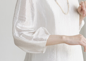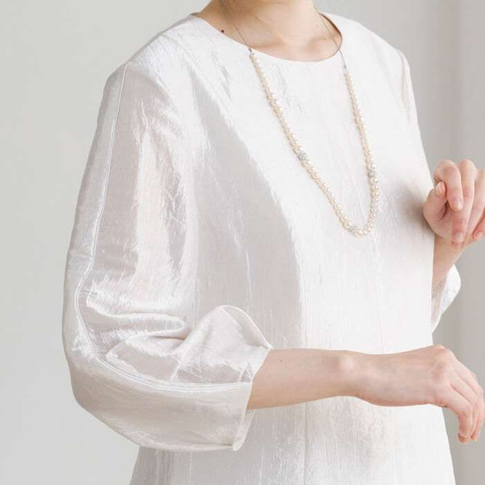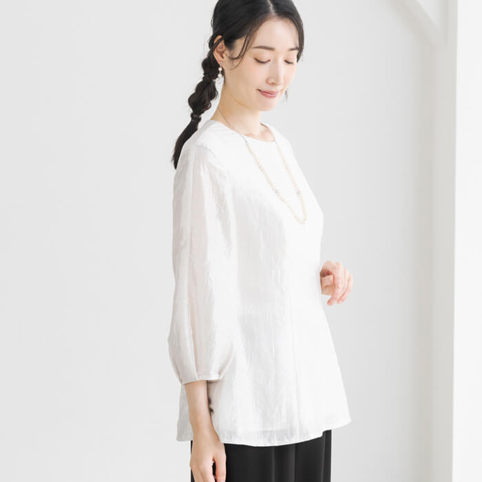 ハリと軽さが特徴の生地による、ふんわりパフスリーブ。 構築的なシルエットが、大人かわいい印象です。
