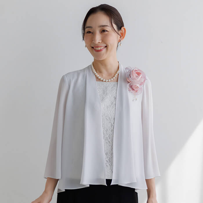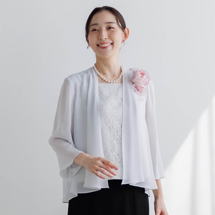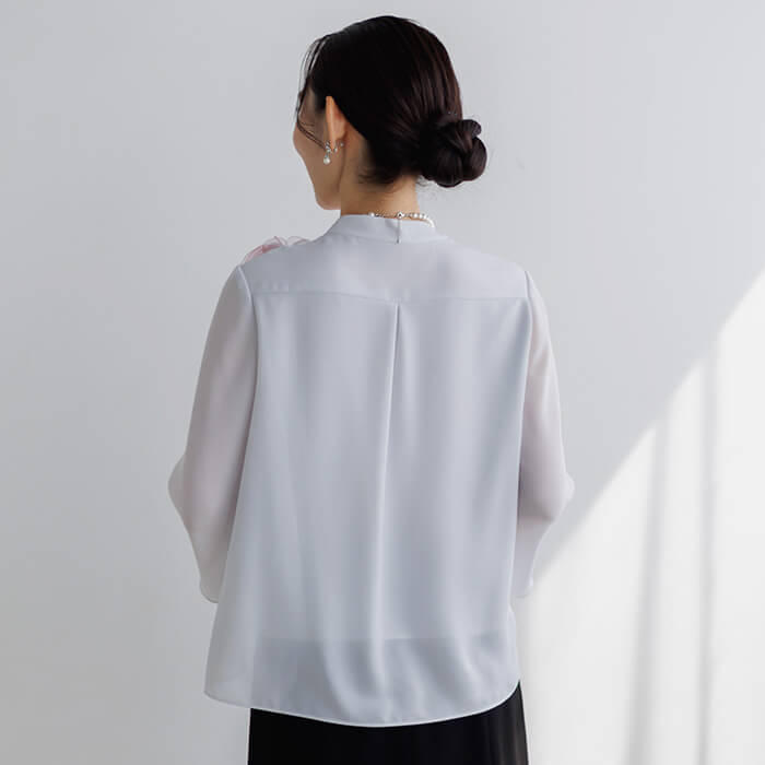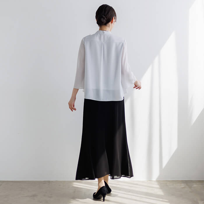 カーディガンを羽織ったように見える重ね着風デザインで、襟元から流れるようなシフォンがエレガント。 後ろ下がりの裾なので、気になる後ろ姿もさりげなく体型カバーしてくれます。 ロングスカートやワイドパンツと合わせてフォーマルシーンはもちろんのこと、組み合わせるアイテムによって様々な着こなしを楽しむことができます。