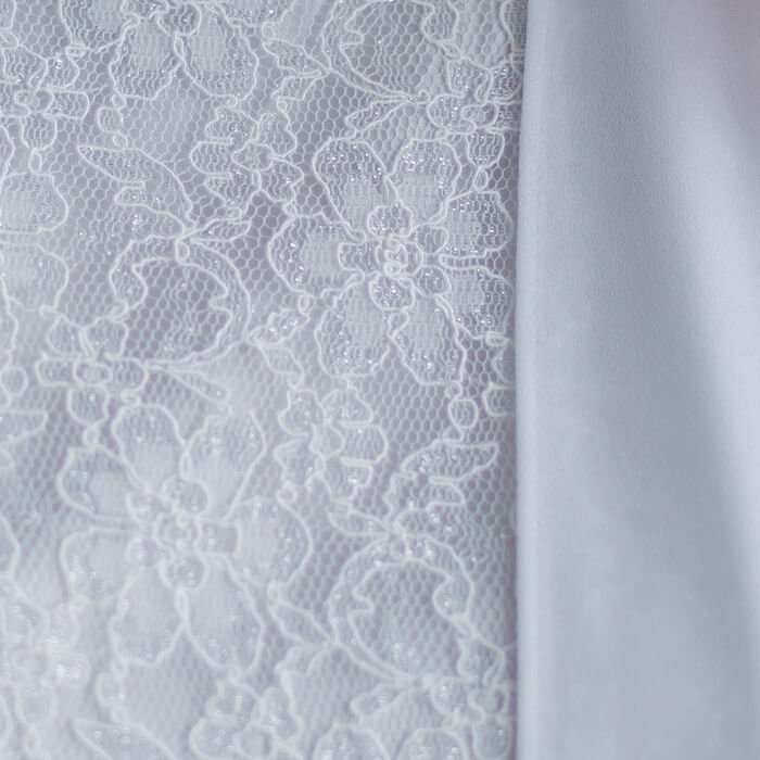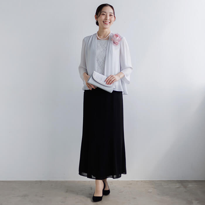 フラワーモチーフの華やかなラメレースは、シフォンと組み合わせることで上品な装いに。