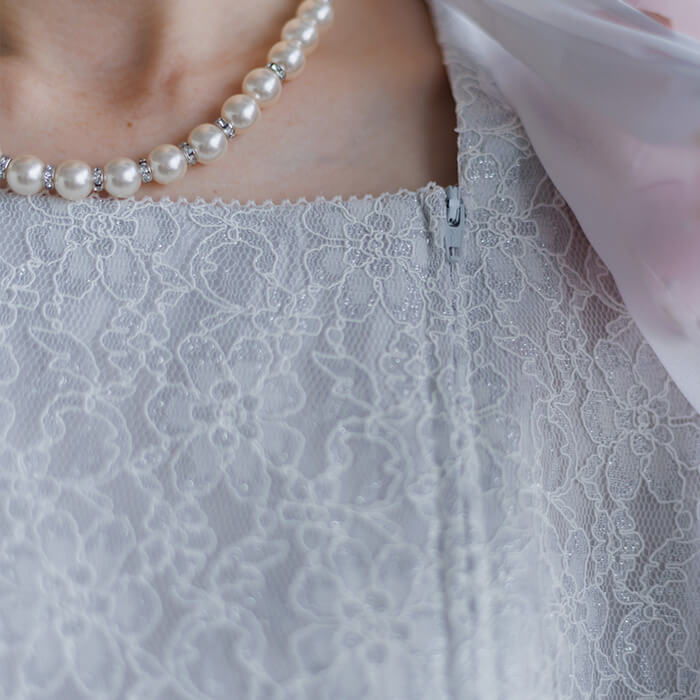 前身頃左内側にはフルオープンになるファスナーが。ヘアやメイクの乱れを気にすることなく簡単に脱ぎ着のできる仕様となっています。