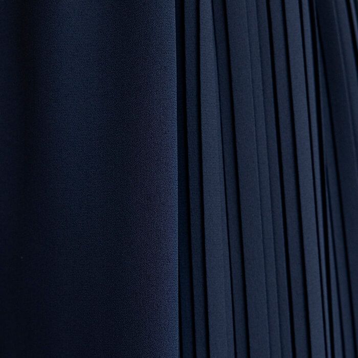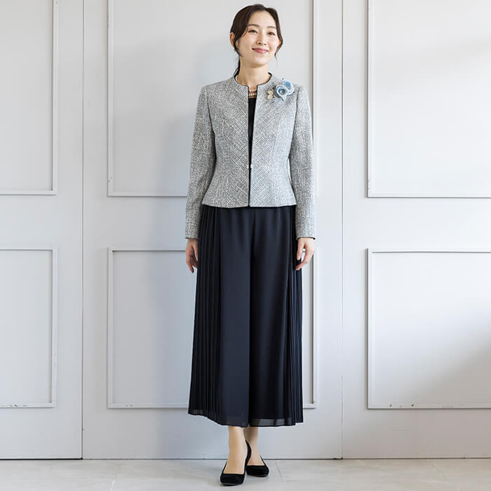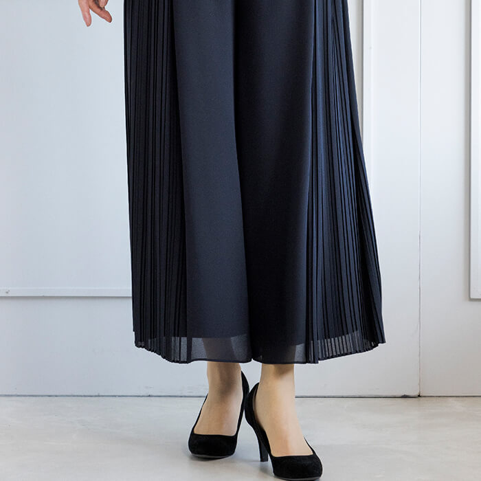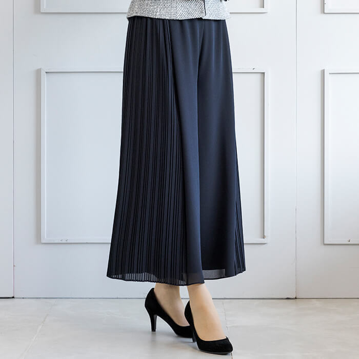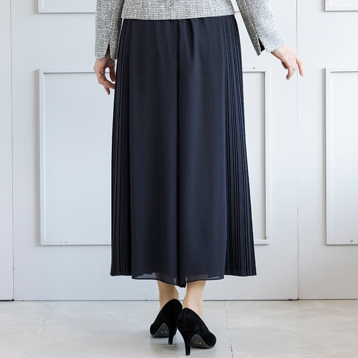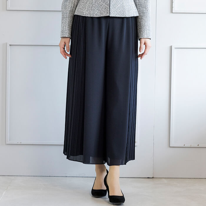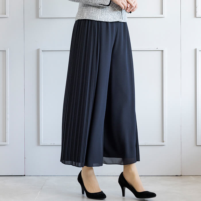 動きに合わせてきれいに広がるサイドプリーツを活かした、シルエットが美しいワイドパンツ。 ロングスカートのようにも見えるエレガントなシルエットで、結婚式やセレモニー等お祝いの席でのミセスの装いにお勧めです。