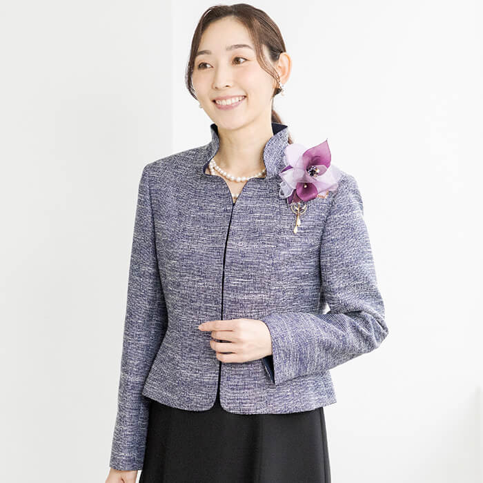 フリルカラーが上品なミセス向けフォーマルジャケット。 ラメ入りのジャカード生地が、華やかなお祝いの席にぴったりの一着。