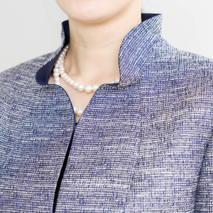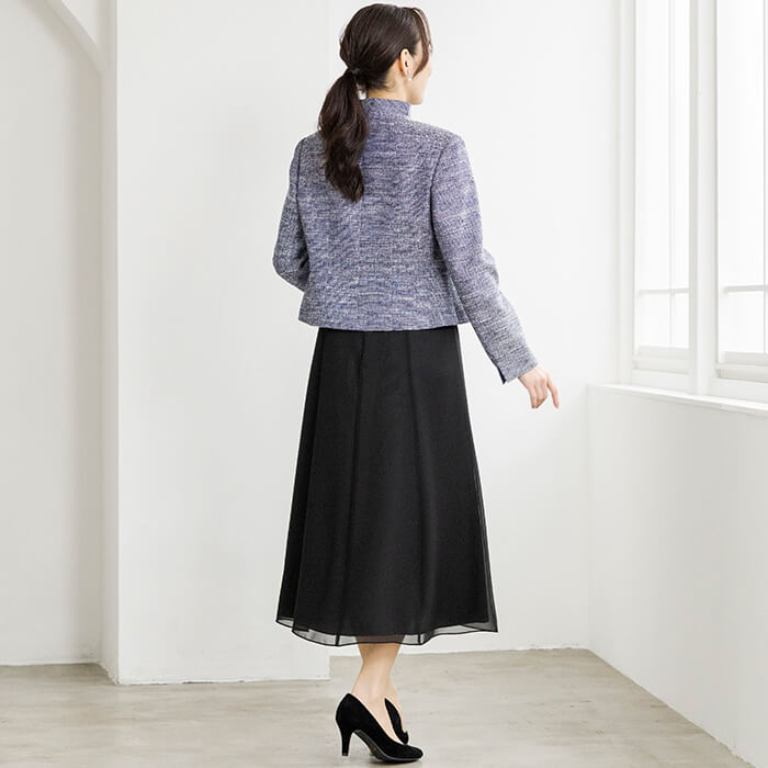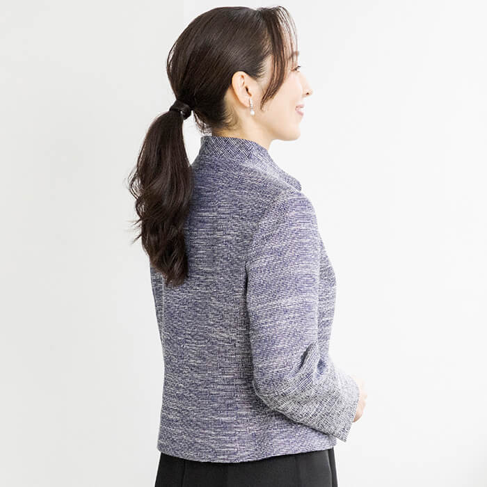 フロントの打ち合わせは3箇所のカギホック仕様ですっきりとした表情。 ボタンではないので、前を開けたままでのご着用もでき、 コーディネートの幅が広がります。 襟は人気のフリル襟。少し立ち上がったスタンドカラーで、 気になる首回りをやさしくカバーしながら、 お顔周りを華やかに見せてくれます。 バランスをキープし厚みを重視した立体フォルムで 美しいシルエットを実現しています。 袖口は、折り返すとサテンが見えるリターンカフス式。 着こなしを変えることができ、袖丈の補正が不要な便利なデザインです。 結婚式のお母様やご親族に、またお食事会や顔合わせにもおすすめです。