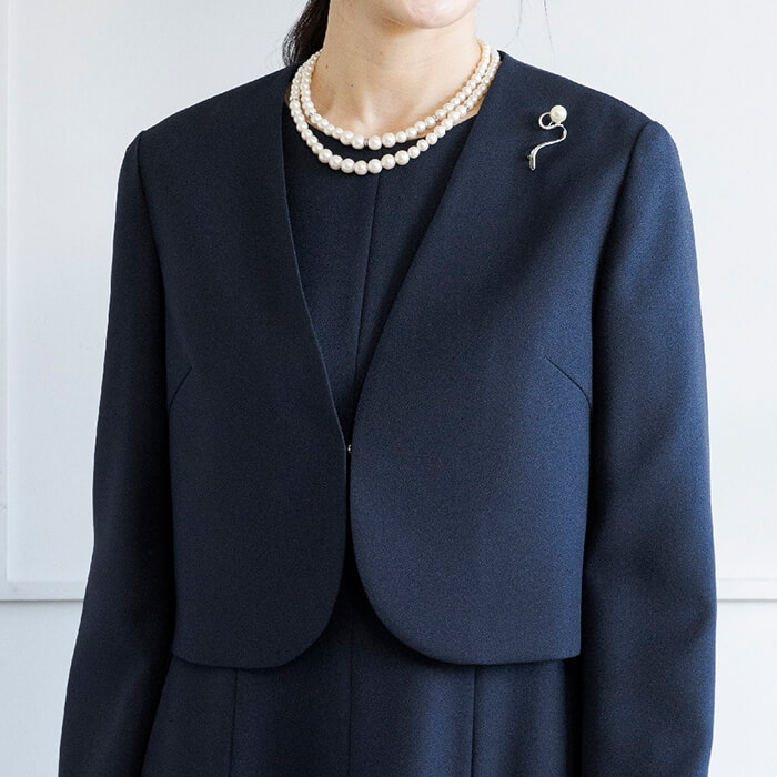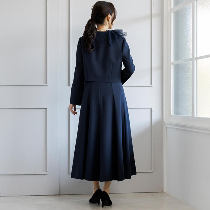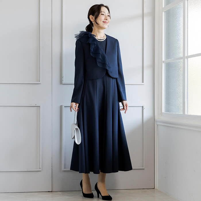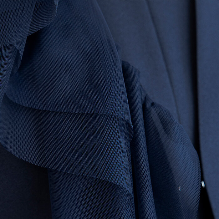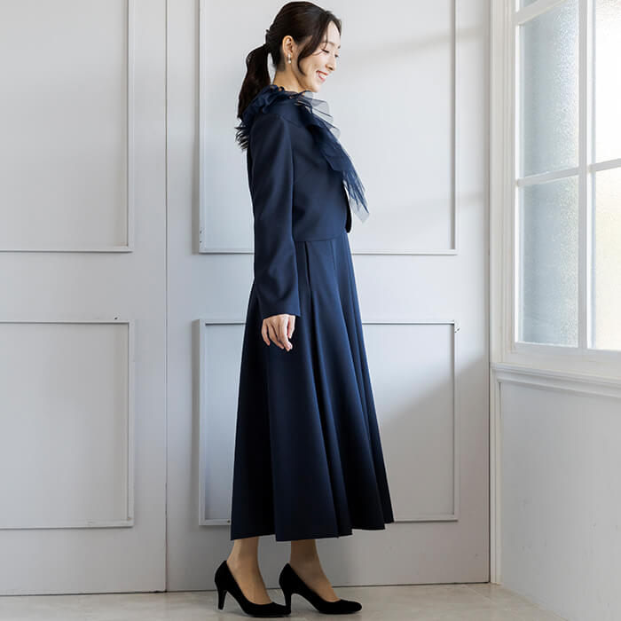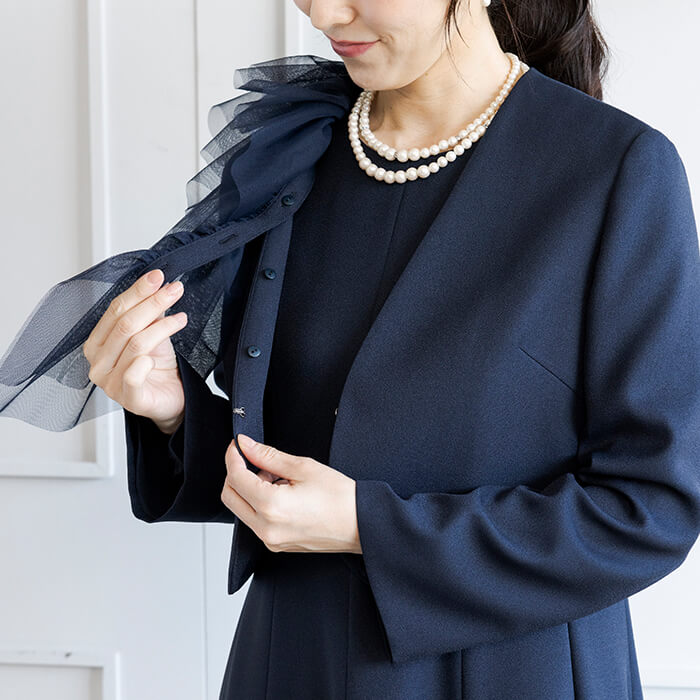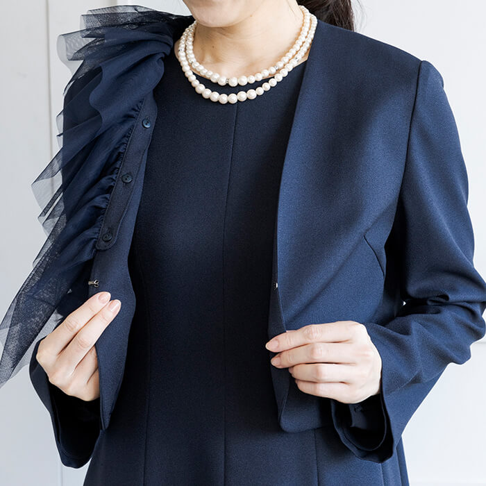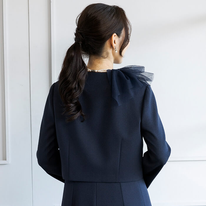 アシンメトリーなチュールデザインが華やかなボレロジャケット。 チュール襟は着脱が可能で、取り外してシンプルなノーカラージャケットとしてもご着用いただけます。 フロントはカギホック1箇所で留める仕様。開けたままの着用でもきれいです。 コンパクトな丈感なので、ワンピースとの組み合わせがおすすめ。 同じ生地で仕上げた別売りのワンピース(1401903)のご用意もございます。