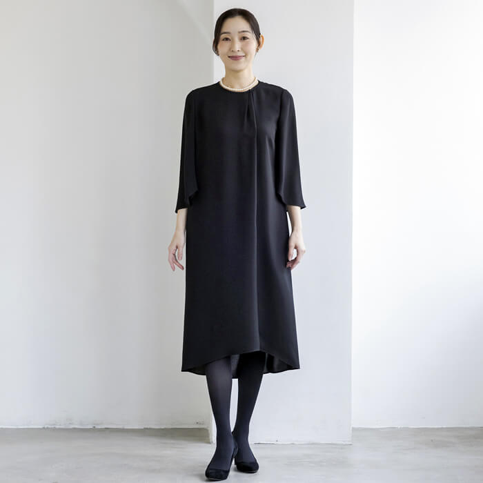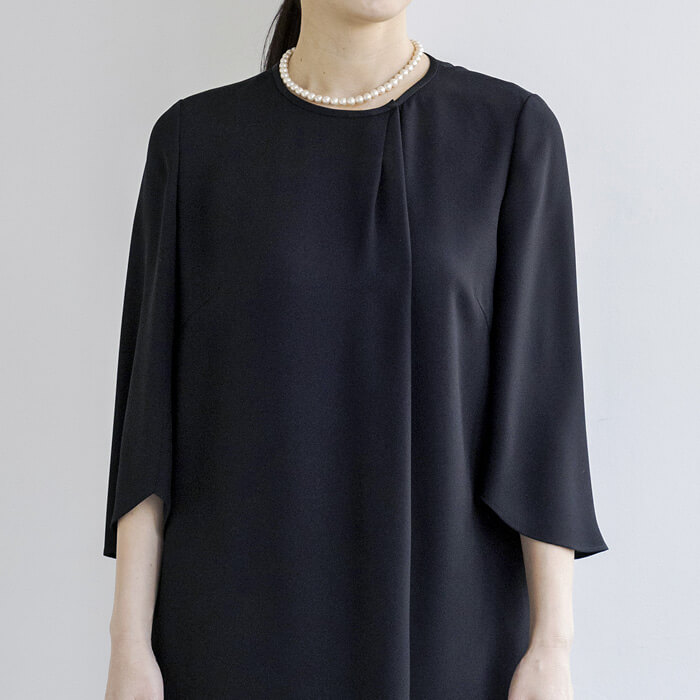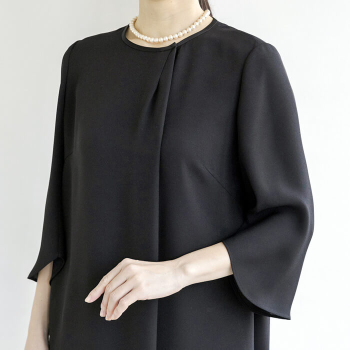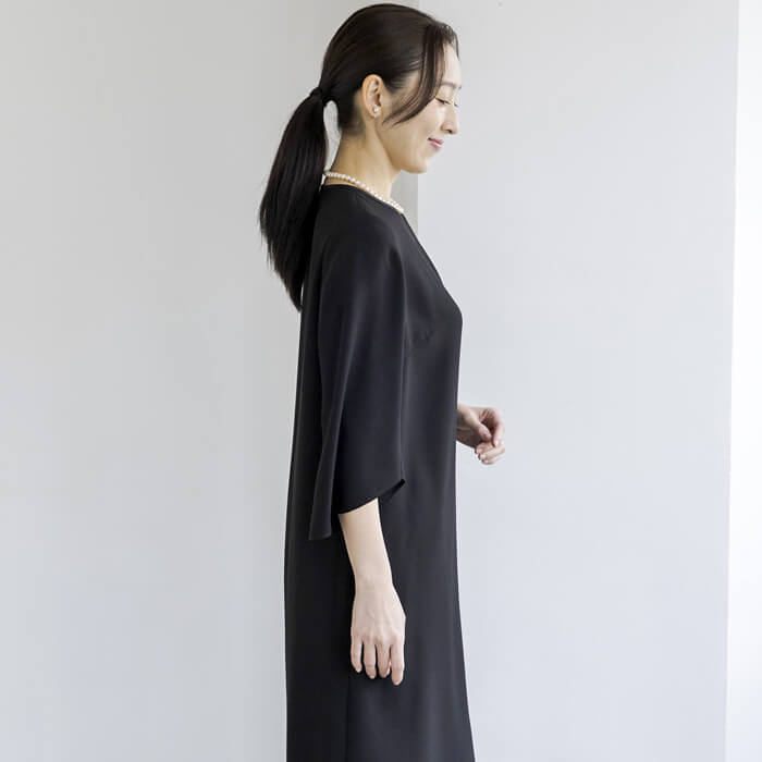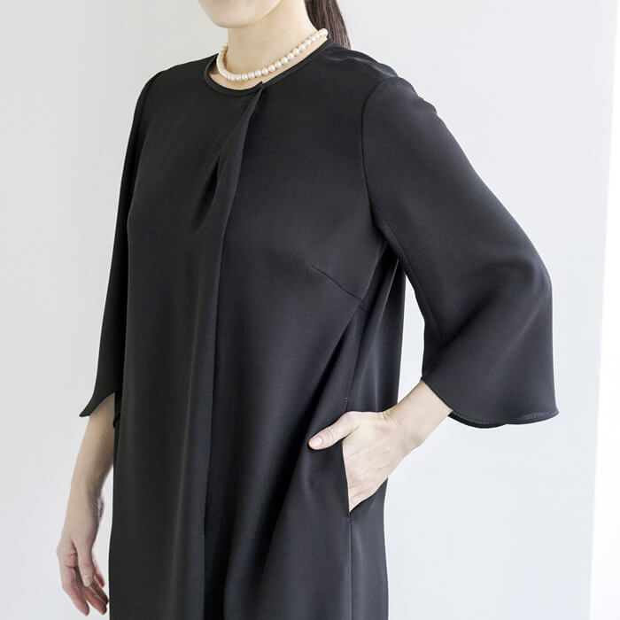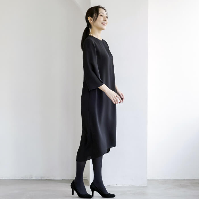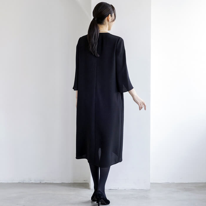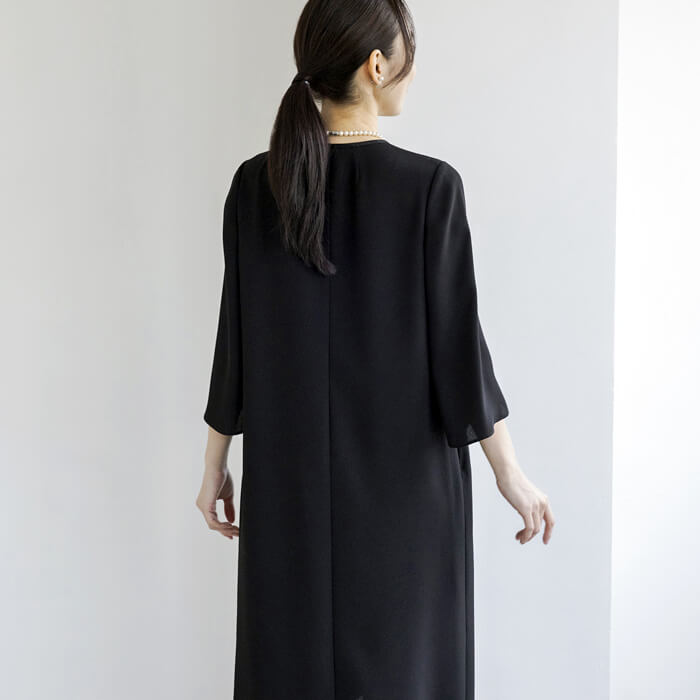 表地は軽やかなバックサテン。 濃染加工による深い黒の生地なので、喪服としてご葬儀、家族葬、お別れの会などにも安心です。 アクセサリーを組み合わせて、慶事のブラックドレスとしてもおしゃれな印象。 パターンは「少しゆったり」、腕回りや背渡りにゆとりのある着心地です。 サイズは、M、Lの2タイプ。季節を問わないオールシーズン用のワンピースです。