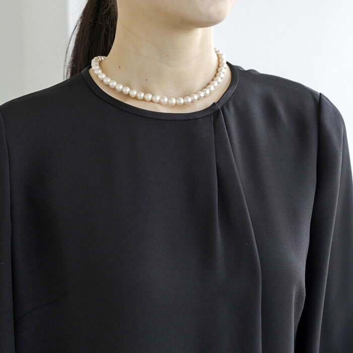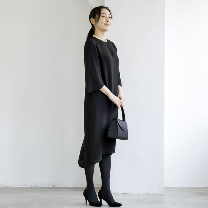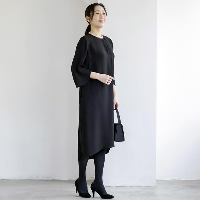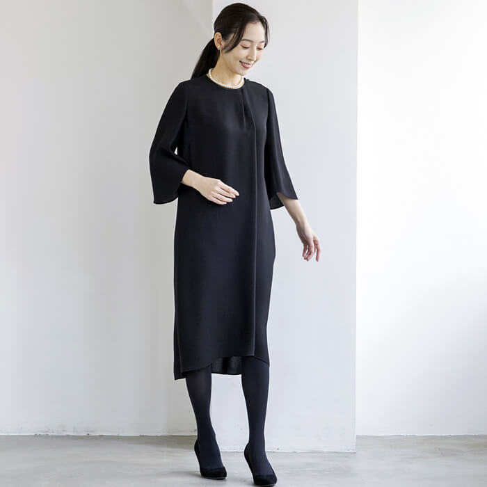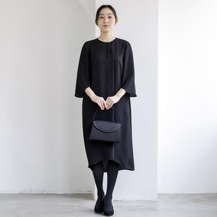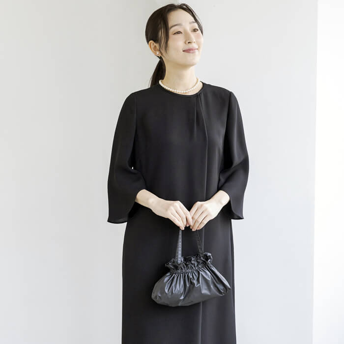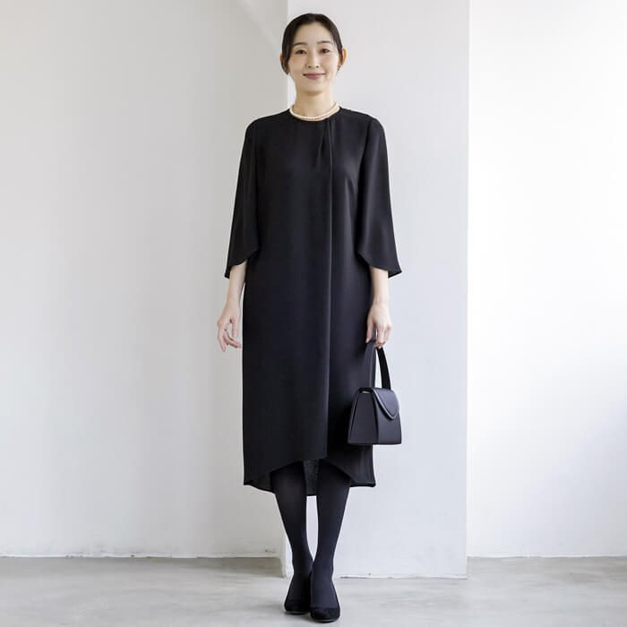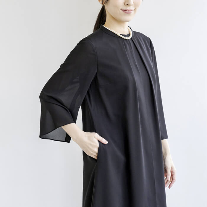 表地は軽やかなバックサテン。 濃染加工による深い黒の生地なので、喪服としてご葬儀、家族葬、お別れの会などにも安心です。 アクセサリーを組み合わせて、慶事のブラックドレスとしてもおしゃれな印象。 パターンは「少しゆったり」、腕回りや背渡りにゆとりのある着心地です。 サイズは、M、Lの2タイプ。季節を問わないオールシーズン用のワンピースです。