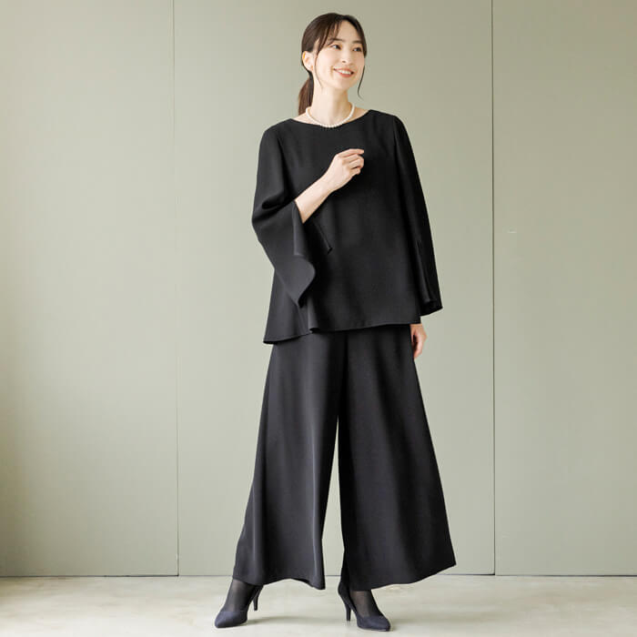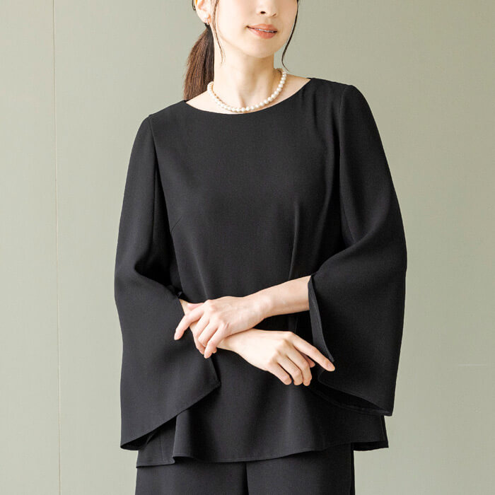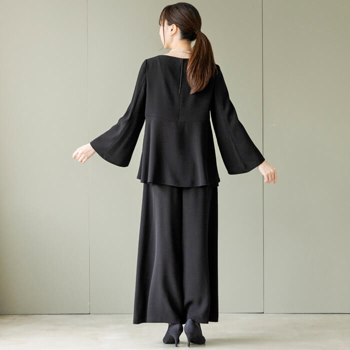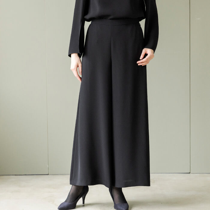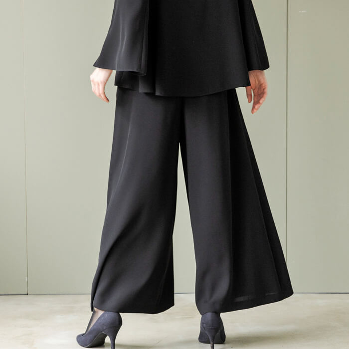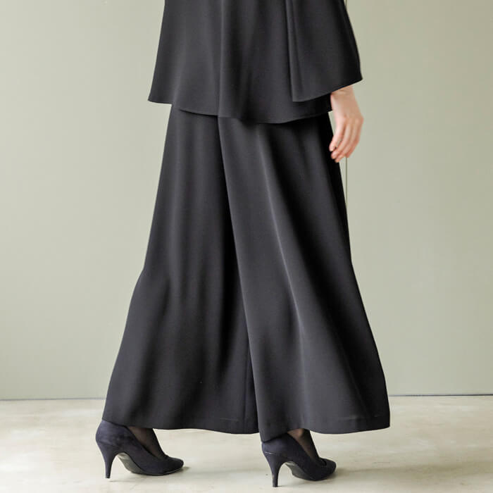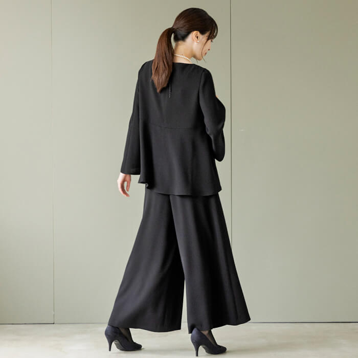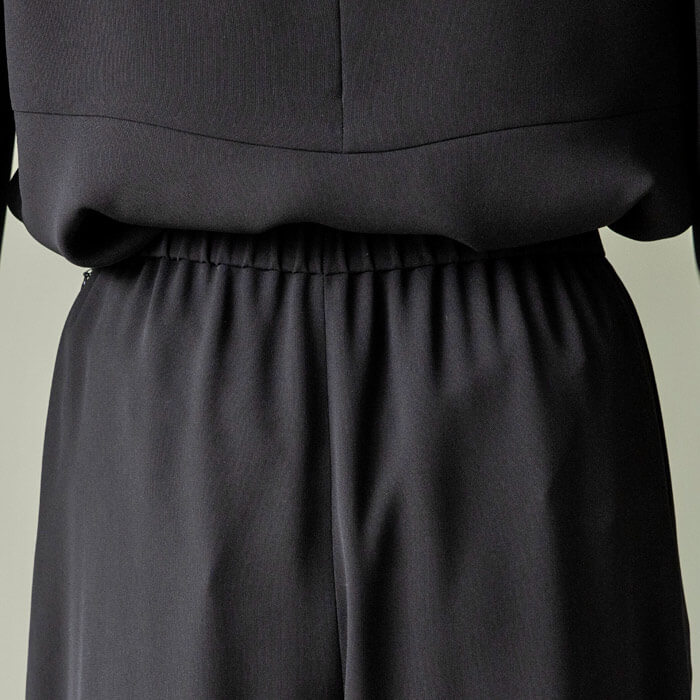 動きやすいストレッチ素材を使用したセットアップスーツ。 ブラウスは袖口のスリットがアクセント。 背面のたっぷりペプラムがモードな雰囲気。 裏地の無い軽やかで快適な着心地です。 パンツはエレガントなワイドシルエット。 ウエスト背面はゴム入りで、ストレスを感じにくい着心地です。 それぞれ単品でも着回しができる便利なアイテム。 オールシーズン対応の中肉素材で、季節を問わず長くご着用いただけます。 葬儀、告別式、送る会などの喪服としても安心な、濃染加工の漆黒の生地です。