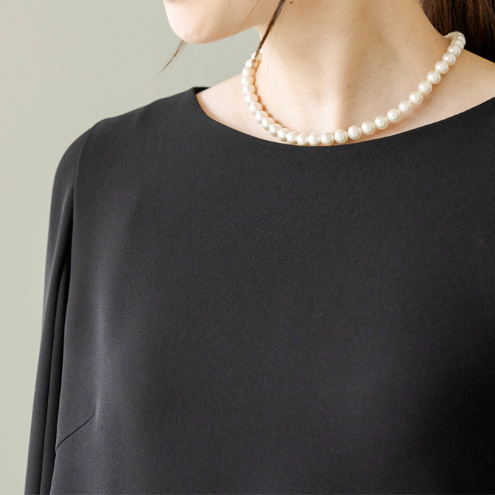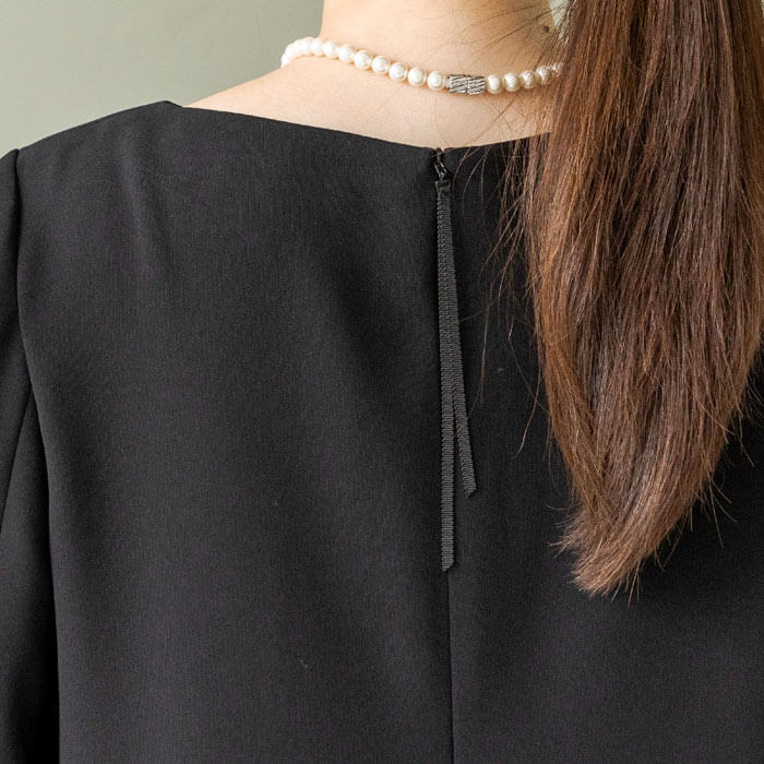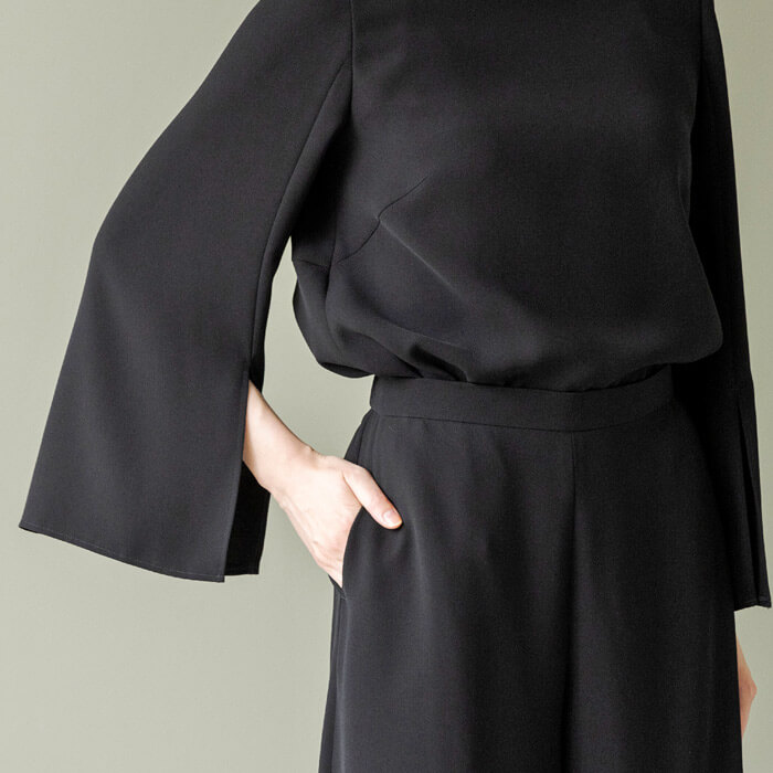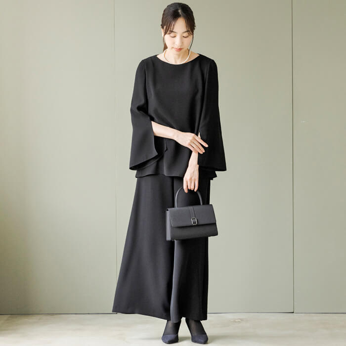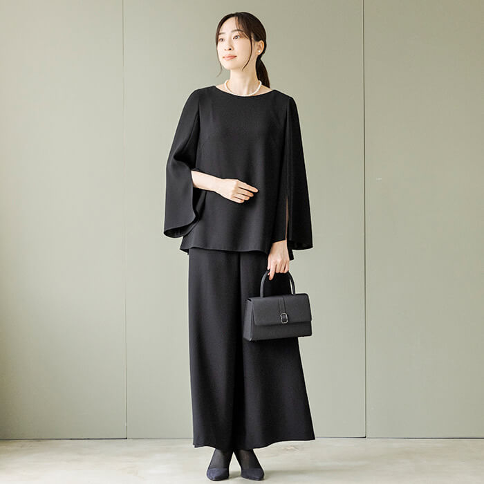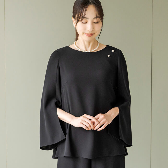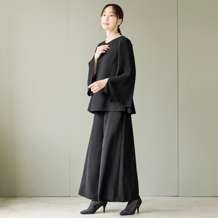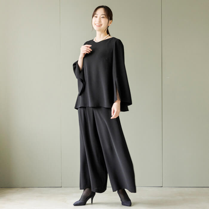 動きやすいストレッチ素材を使用したセットアップスーツ。 ブラウスは袖口のスリットがアクセント。 背面のたっぷりペプラムがモードな雰囲気。 裏地の無い軽やかで快適な着心地です。 パンツはエレガントなワイドシルエット。 ウエスト背面はゴム入りで、ストレスを感じにくい着心地です。 それぞれ単品でも着回しができる便利なアイテム。 オールシーズン対応の中肉素材で、季節を問わず長くご着用いただけます。 葬儀、告別式、送る会などの喪服としても安心な、濃染加工の漆黒の生地です。