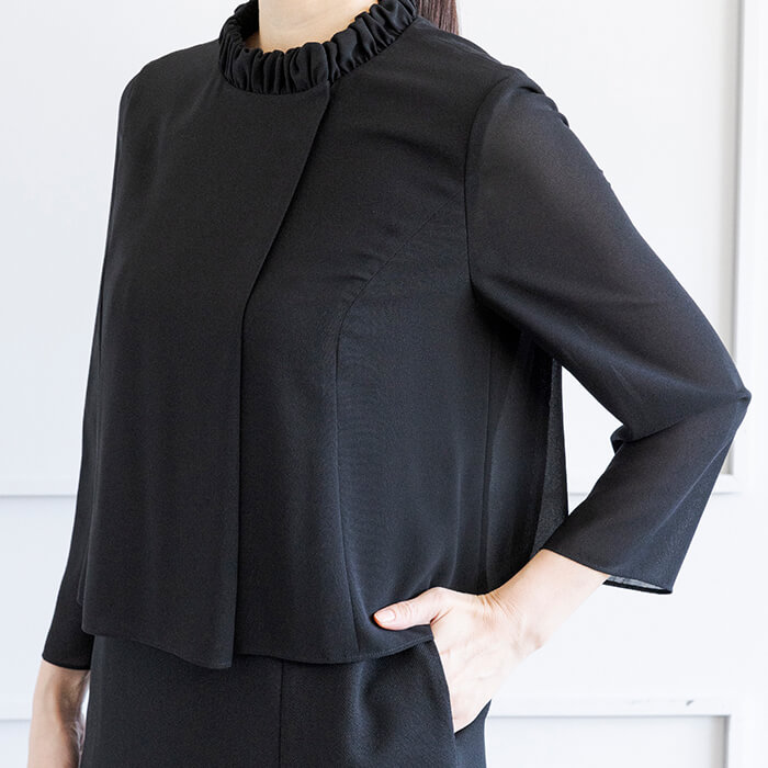 ショールカラーのジャケットとややハイネックのワンピースを合わせた上品な印象のアンサンブル。 ジャケットはフロントの1つボタンで留める仕様。両サイドにはポケットを配しました。 袖口はスリット入りで折り返して着用できるので、お直し入らずでご着用いただけます。