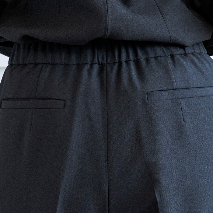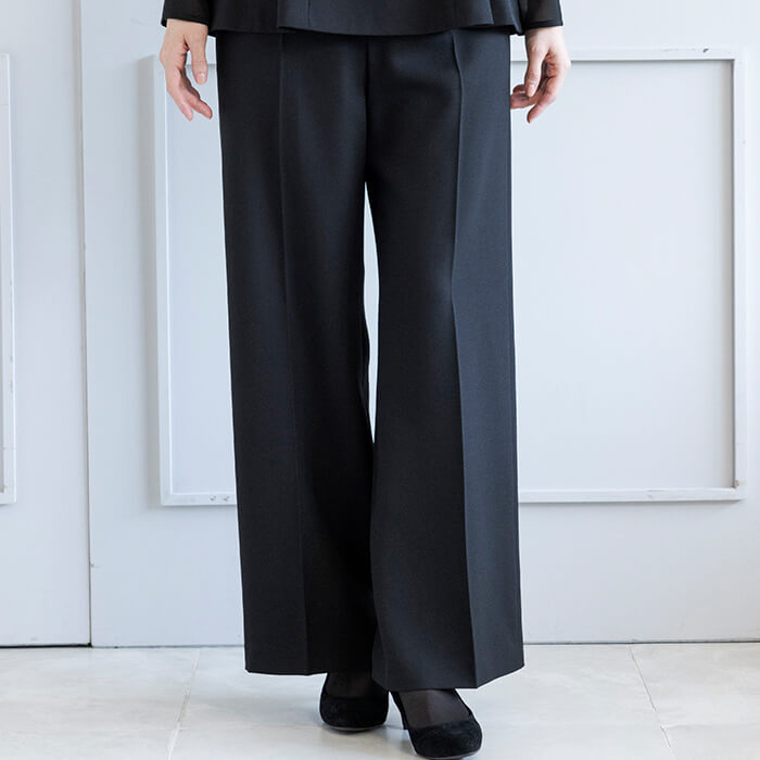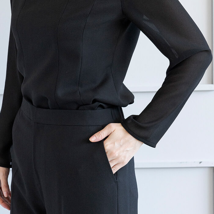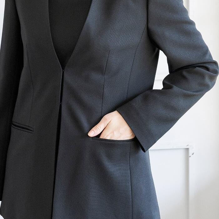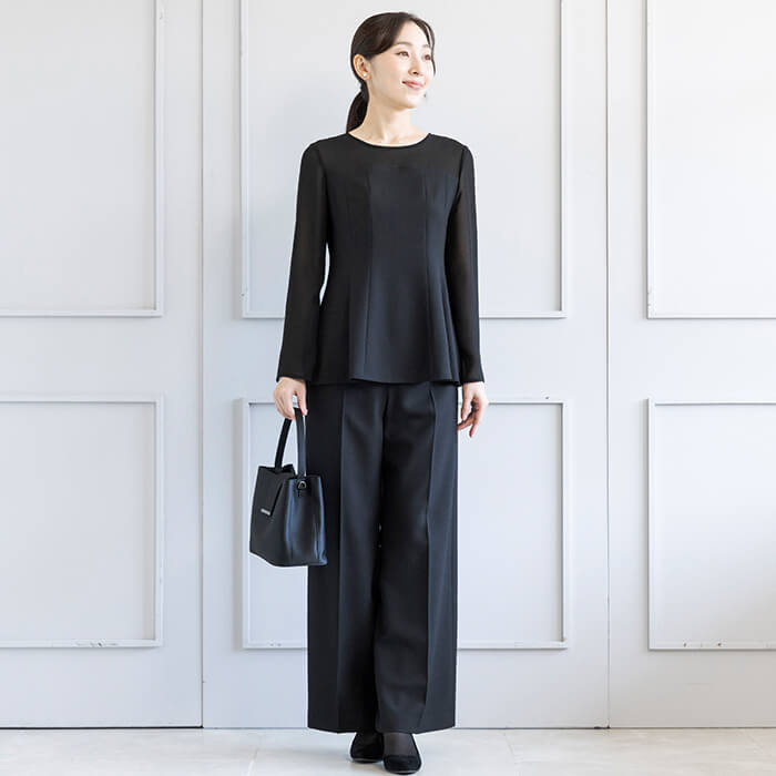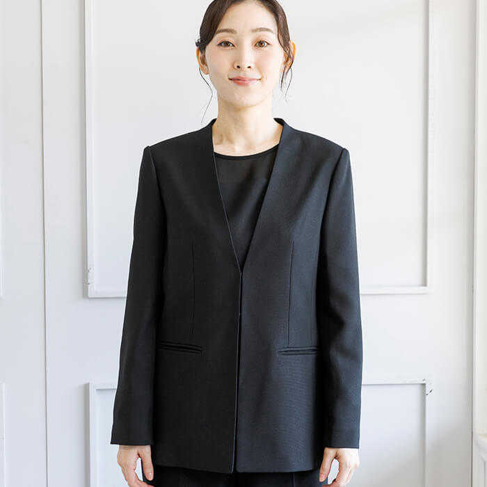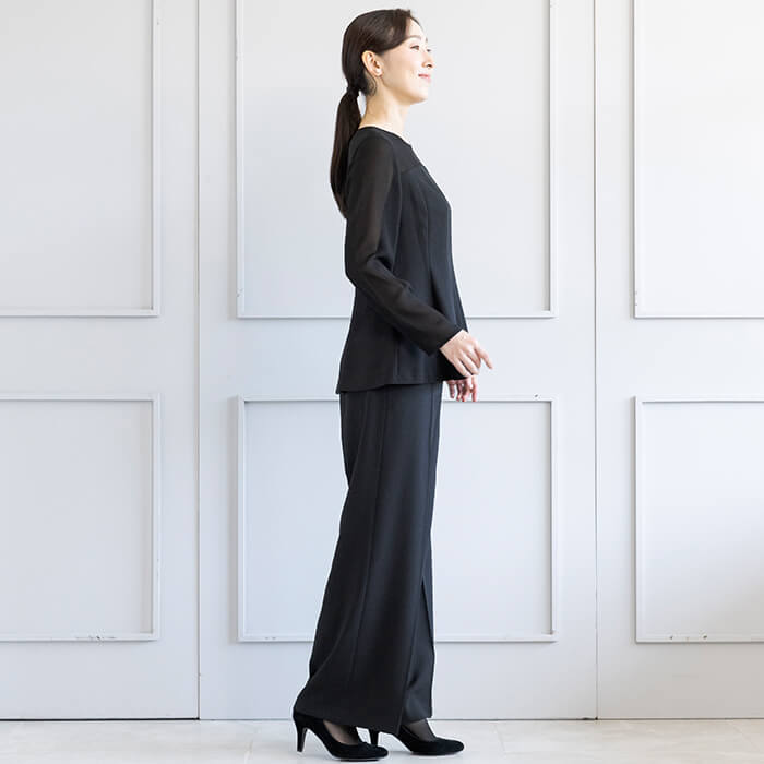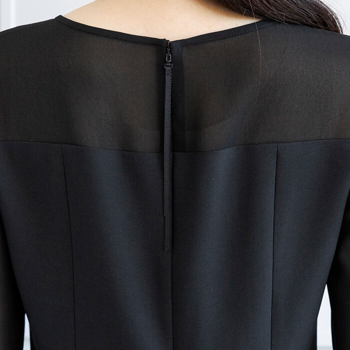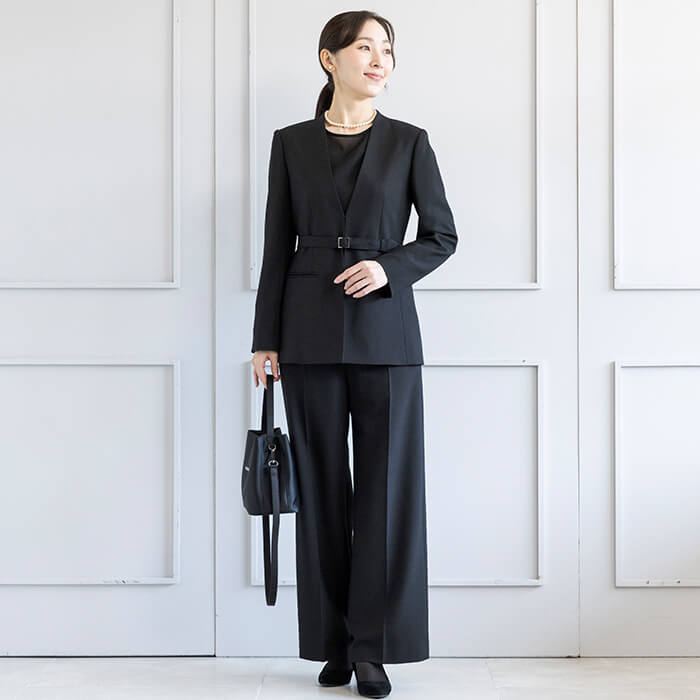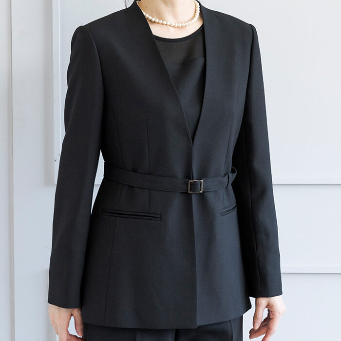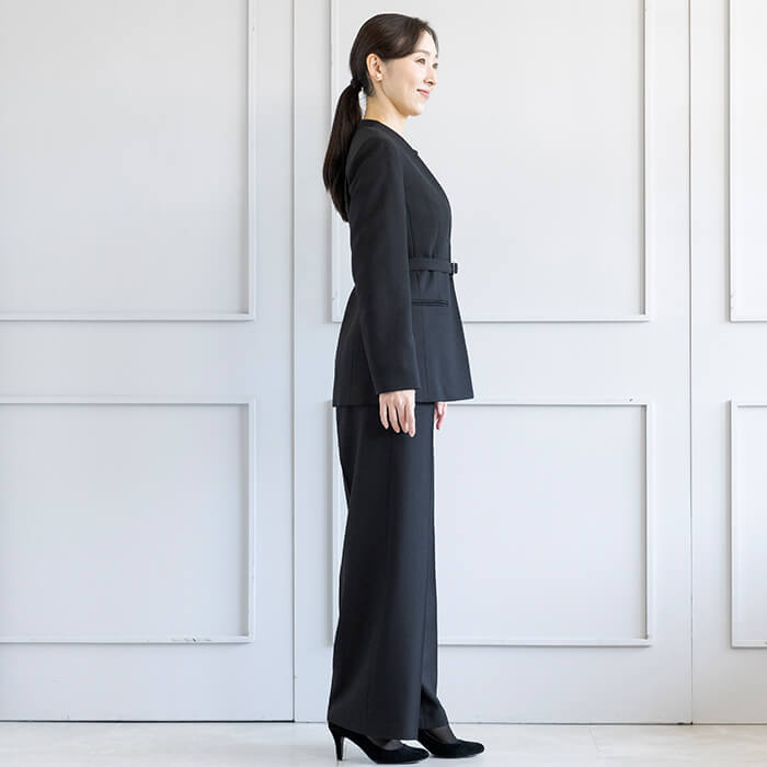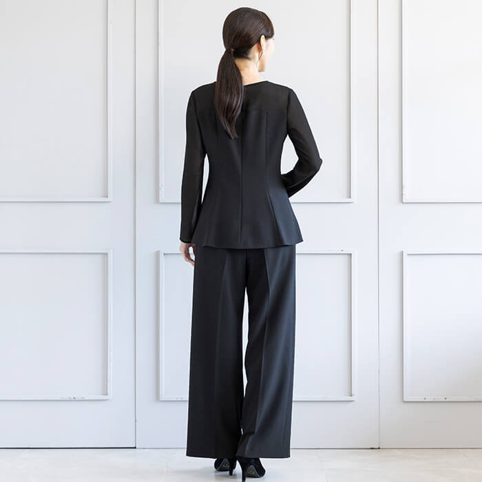 ジャケットはヒップにかかる安心の丈で両サイドには便利なポケット付。 付属の共布ベルトは取り外して雰囲気を変えることも可能です。 フロントは2か所のカギホックで留めるタイプ。開けた状態でもきれいにお召しいただけます。 ブラウスはデコルテと袖部分を透け感のある生地で切り替えたデザイン。 ビスチェをレイヤードしたような雰囲気で、普段使いにもおしゃれに着回していただけます。 広がる裾のラインは腰回りを自然にカバーしてくれるので、ジャケットを脱いでも安心です。 パンツはセミワイドなシルエット。センタープレスで足をきれいに見せてくれます。後ろ側はゴム仕様、両サイドと背面に計4つのポケットがあり便利。 こちらはご自宅で洗えるウォッシャブル。 お洗濯方法はウォッシャブルフォーマルのお洗濯方法をご覧ください。