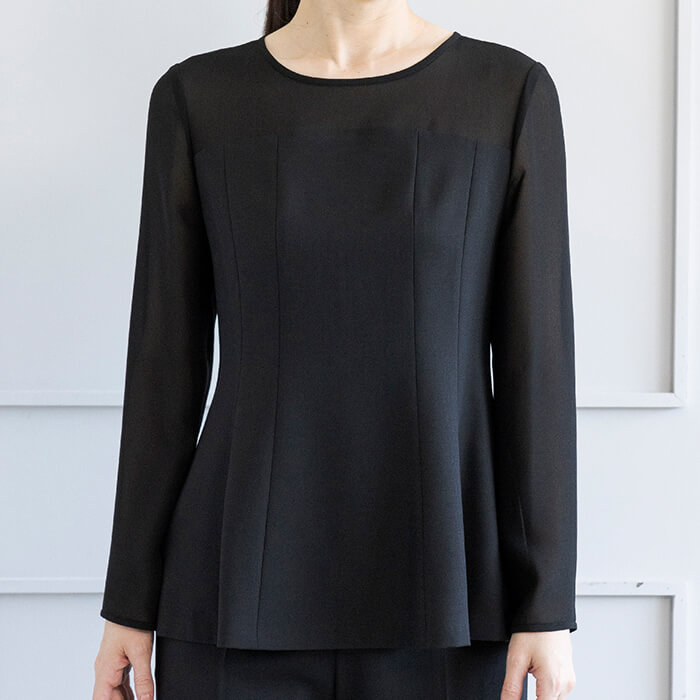 ブラウスはやや透け感のある切り替え生地がポイント。 ジャケットの襟元からさりげなく覗くとスタイリッシュな雰囲気。