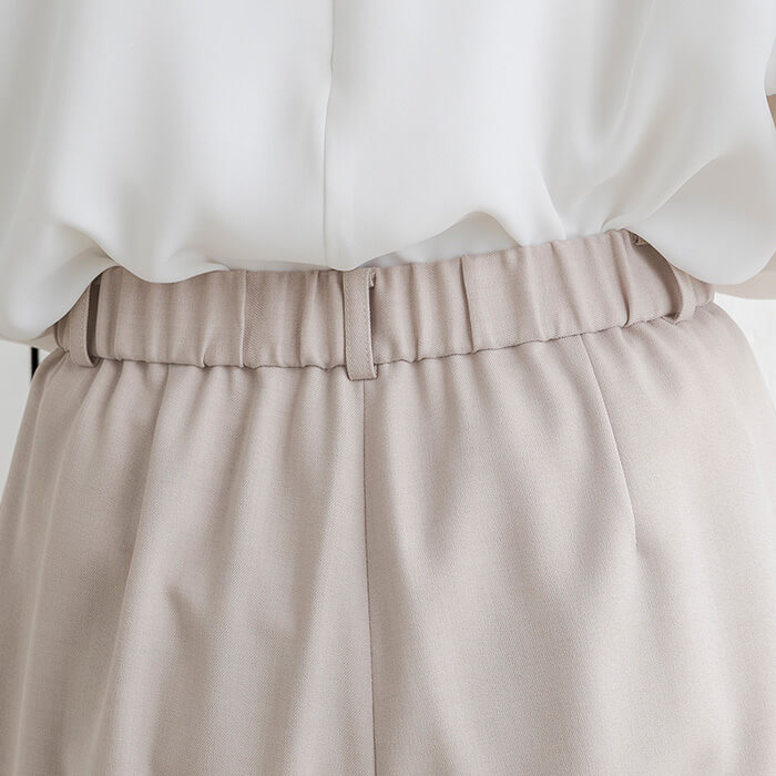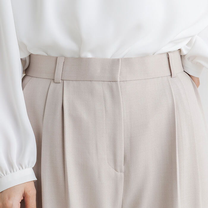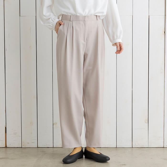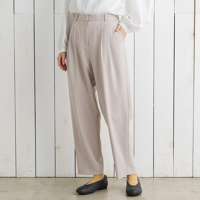 前にタックを入れた美脚シルエットのパンツ。両脇には便利なポケット付き。ベルト通しもついているので、ブラウスやインナーをインした着こなしも可能。