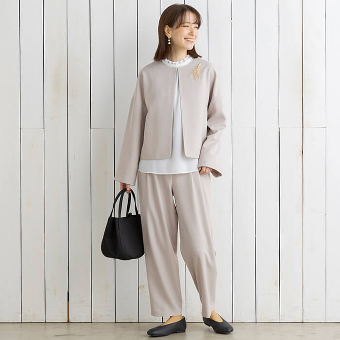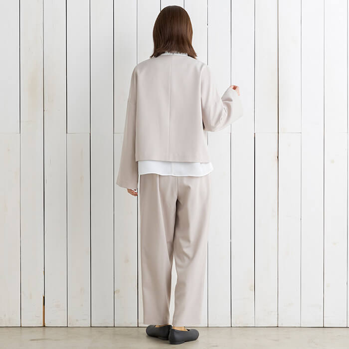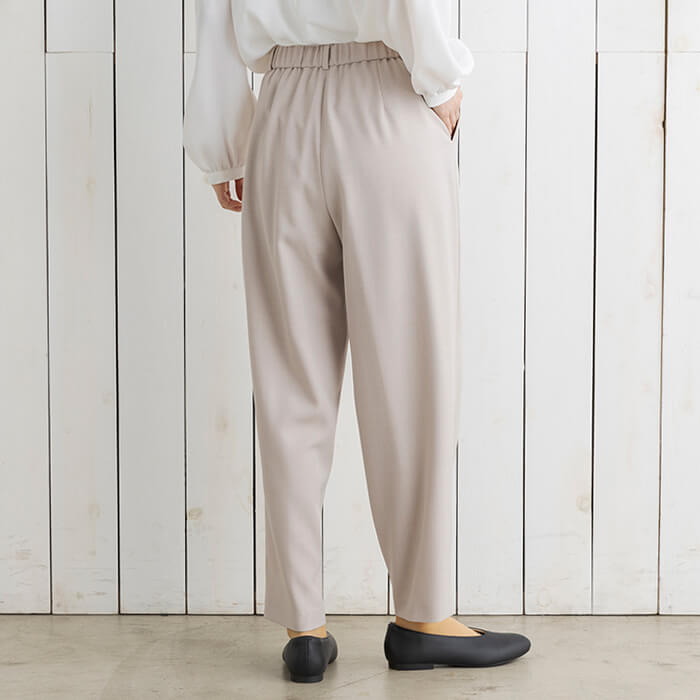 脚のラインを拾わない美脚シルエットのテーパード型パンツ。後ろはゴム仕様で着心地が良く、シンプルなデザインと素材でセレモニーはもちろん、普段使いもできるアイテム。別売りのジャケット(2610901-00・2610901-31)と合わせるとセットアップになります。