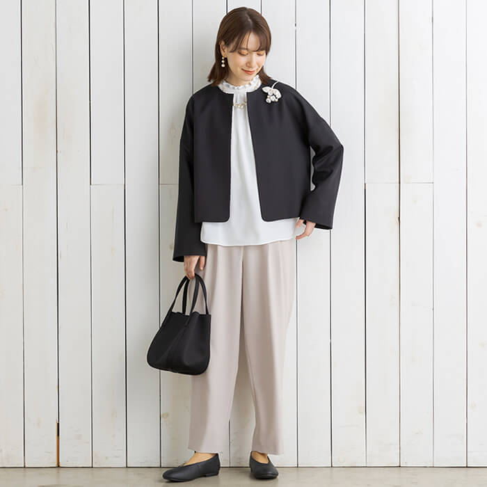 洗濯方法:ご自宅で洗濯可 フロントファスナー 後ろウエストゴム仕様(+12cm伸長) 共布ベルト通し付き ※モデル着用: ブラウス / 2606902-12 ジャケット(ブラック) / 2610900-00 ジャケット(ベージュ) / 2610900-31 イヤリング / 5551991-10 ※モデル:身長166cm 9号着用 |