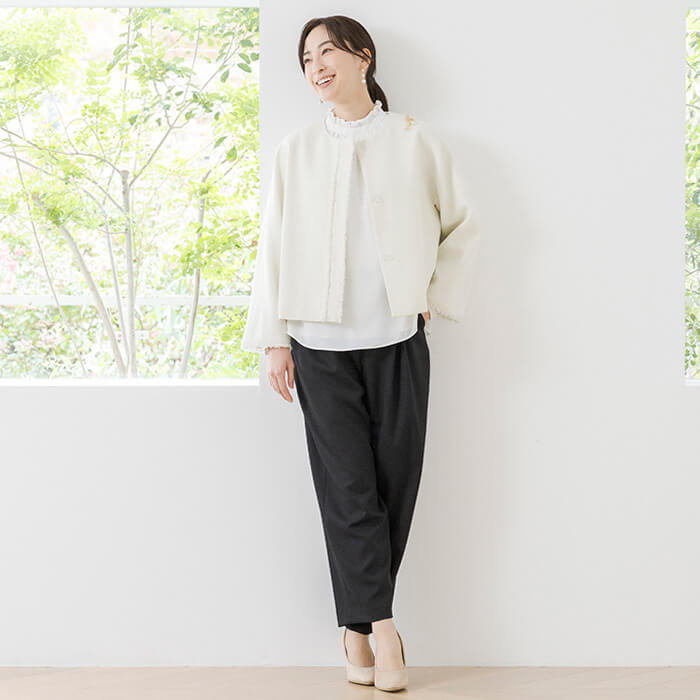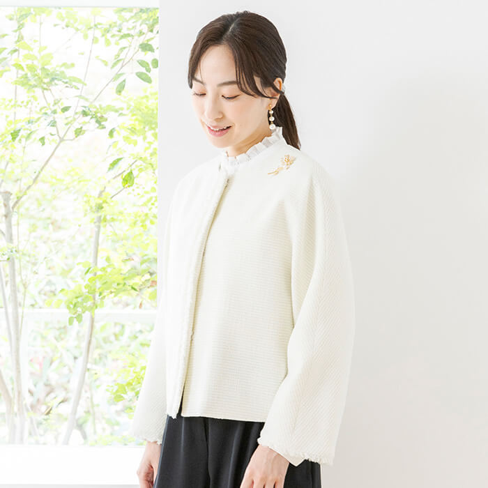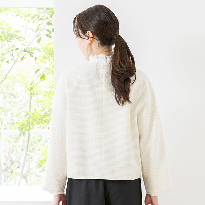 意匠糸の入った華やかなツイードジャケット。ゆったりとした身幅で、窮屈感なく着用できます。丸みのあるシルエットで、柔らかく上品な印象。前端と袖口のフリンジがポイントに。パンツやワンピースにも合わせやすく、1着持っていると便利なアイテム。 別売りのパンツ(2607903-00・2607903-31)やブラウス(2606902-12)合わせるとセットアップになります。