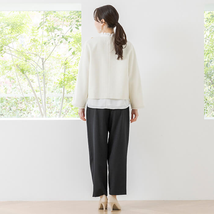 洗濯方法:クリーニング ※裄丈:首の後ろ付け根部分から肩先の中心を通って袖口までの長さ ※モデル着用: ブラウス / 2606902-12 パンツ / 2607903-00 イヤリング / 5551991-10 ブローチ / 5553935-92 バッグ / 5522985-01 手提げバッグ / 5820391-00 ※モデル:身長165cm 9号着用 |