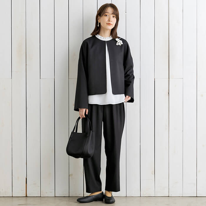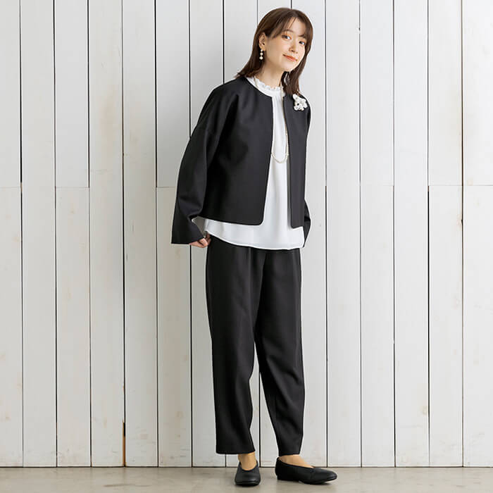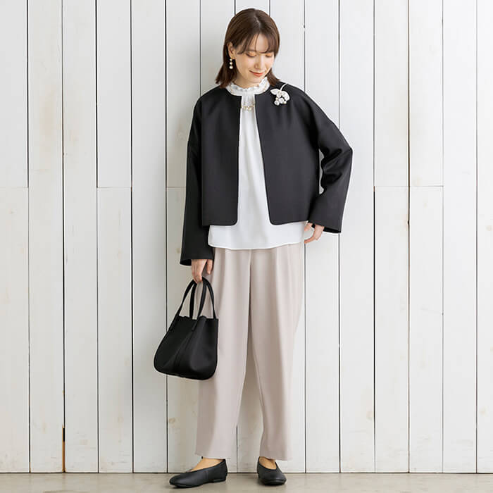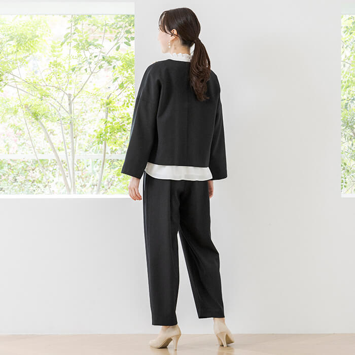 袖にボリュームのあるアイテムとも合わせやすいノーカラージャケット。シンプルでゆったりとした着心地のジャケットは、パンツやワンピースにも合わせやすく、1着持っていると便利なアイテム。別売りのパンツ(2607903-00・2607903-31)と合わせるとセットアップになります。