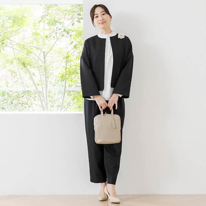 洗濯方法:ご自宅で洗濯可 ※裄丈:首の後ろ付け根部分から肩先の中心を通って袖口までの長さ ※モデル着用: ブラウス / 2606902-12 パンツ(ブラック) / 2607903-00 パンツ(ベージュ) / 2607903-31 イヤリング / 5551991-10 ネックレス(パール) / 5519691-10 ブローチ / 5553916-10 ブラックバッグ / 5820301-00 ベージュバッグ / 5820302-31 ※モデル:身長166cm 9号着用 |