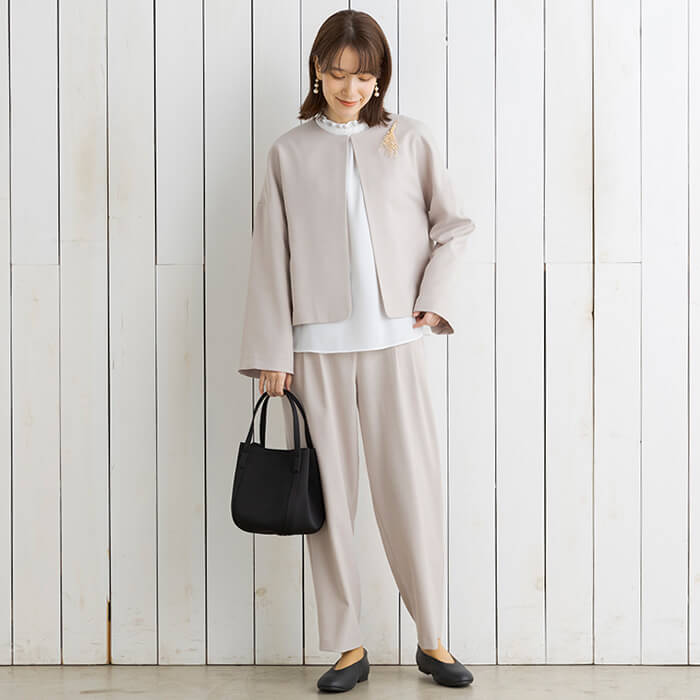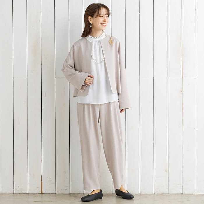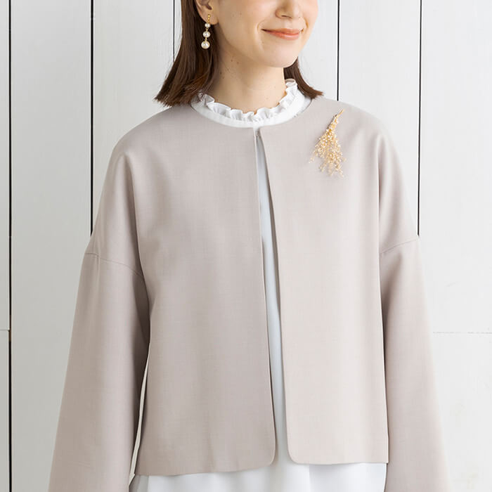 袖にボリュームのあるアイテムとも合わせやすいノーカラージャケット。シンプルでゆったりとした着心地のジャケットは、パンツやワンピースにも合わせやすく、1着持っていると便利なアイテム。別売りのパンツ(2607903-00・2607903-31)と合わせるとセットアップになります。
