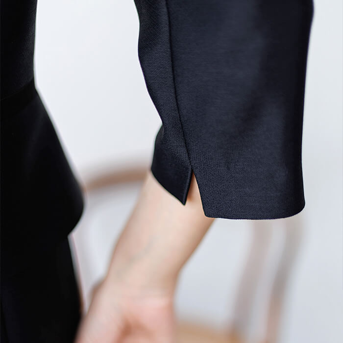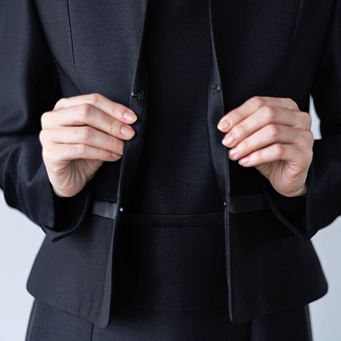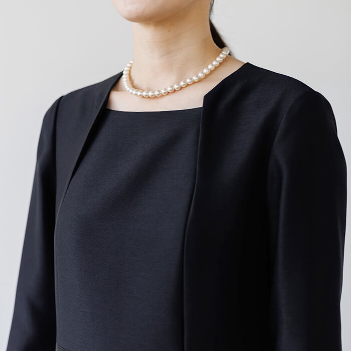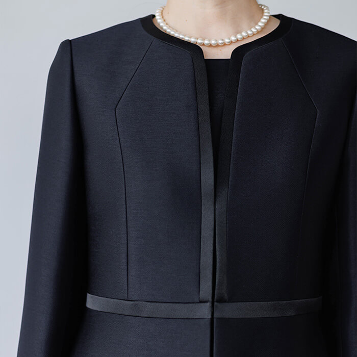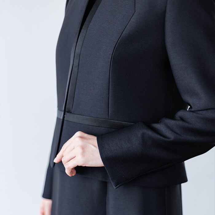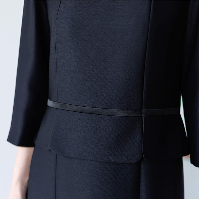 膝が隠れる着丈。全体的にかなりゆとりを持たせたパターン。いつも着用されているお洋服の号数のワンサイズアップに近い着用感です。ジャケット、ワンピース共にの濃染加工をしてる漆黒の生地を使用。参列者としてはもちろんのこと、ご親族の立場にもおすすめできるブラックフォーマルです。