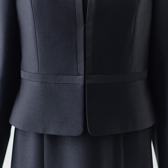 膝が隠れる着丈。同じデザインのレギュラーサイズよりも、更に全体的にゆとりを持たせたパターンで仕上げています。ジャケット、ワンピース共にの濃染加工をしてる漆黒の生地を使用。参列者としてはもちろんのこと、ご親族の立場にもおすすめできるブラックフォーマルです。