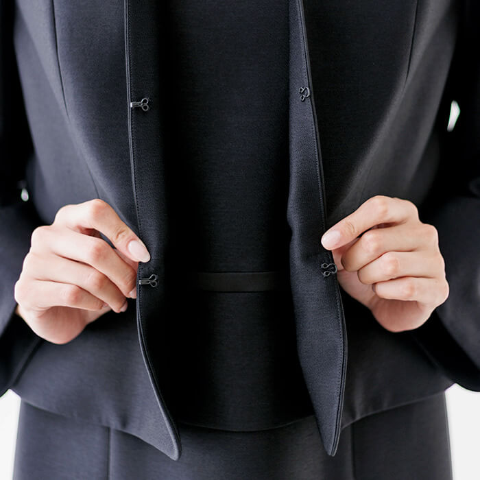 ワンピースは、セミフレアのラインが描く緩やなやな揺らぎが魅力。女性らしいしなやかさをまといながら、前開きファスナー仕様で着脱もスムーズに。見た目の美しさと実用性を両立させています。フォーマルの中に“今”の“エレガンス”を感じさせる1着です。
