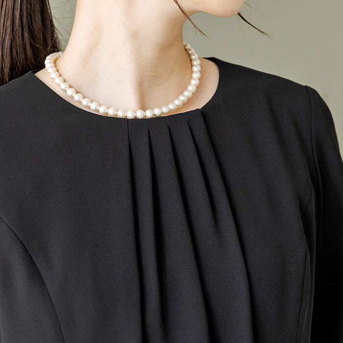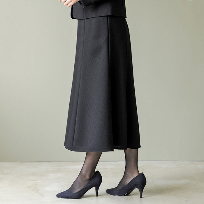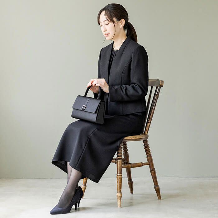 ワンピースの着丈は、ふくらはぎにかかるミモレ丈。 参列者としてはもちろんのこと、喪主やご親族の立場にもお勧めできるフォーマルです。 キャリア(30〜40代)を中心とした、メリハリのあるボディラインに適した寸法です。