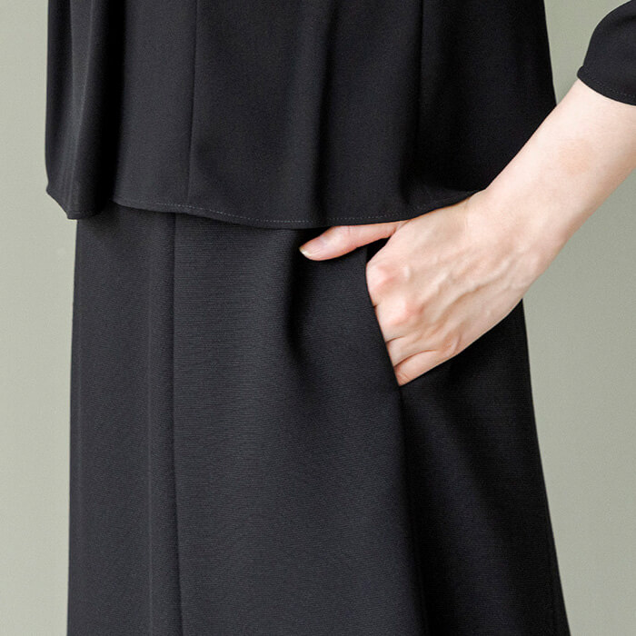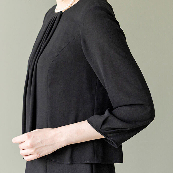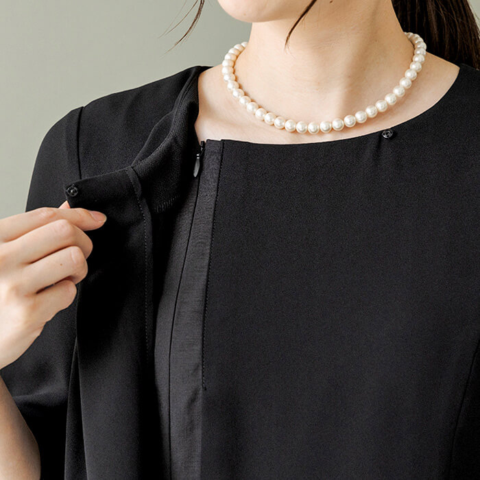 都会的な印象のスタンドカラーのジャケットに、ミモレ丈の前開きワンピースをセットにしたアンサンブル。 ジャケットの袖はスリット入りで、折り返してカフスにアレンジでき、丈詰めもいらない便利なデザイン。 両側のポケットも機能的です。 セットアップ風に見えるワンピースは、一枚仕立てのトリックドレス。 前開きなので、腕を回さず着替えができ、左側にポケットをつけました。 暑い季節はワンピース一枚できちんと見える、正統派のデザインです。 使用している生地は、濃染加工による深い黒。 喪服としても礼服としても安心してご着用いただけます。
