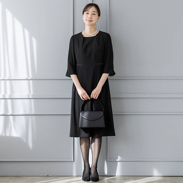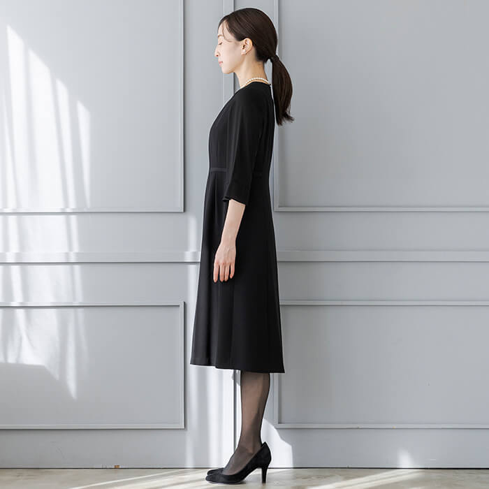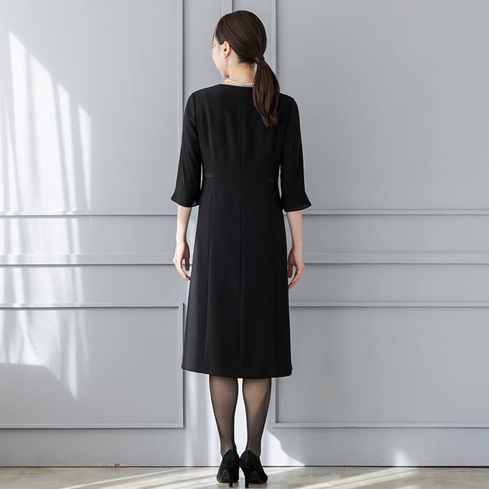 ワンピースはゆるやかなAライン。 着丈は、参列者として一般的な膝にかかる標準丈。 キャリア(30〜40代)を中心とした、メリハリのあるボディラインに合わせた寸法です。